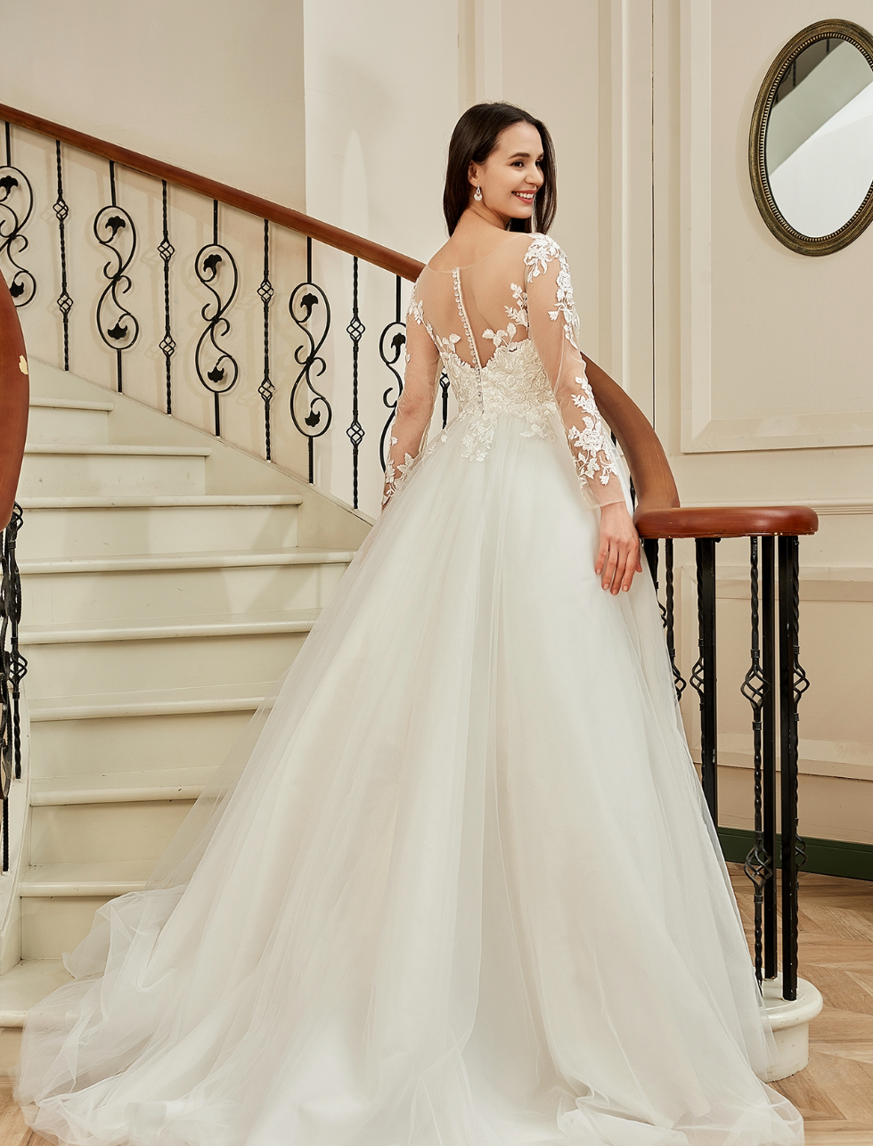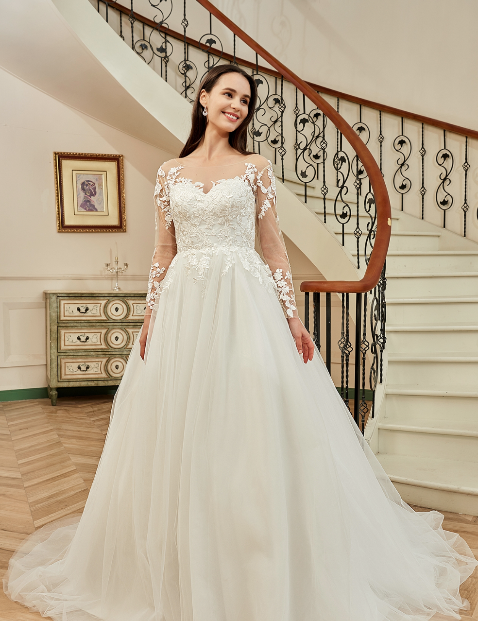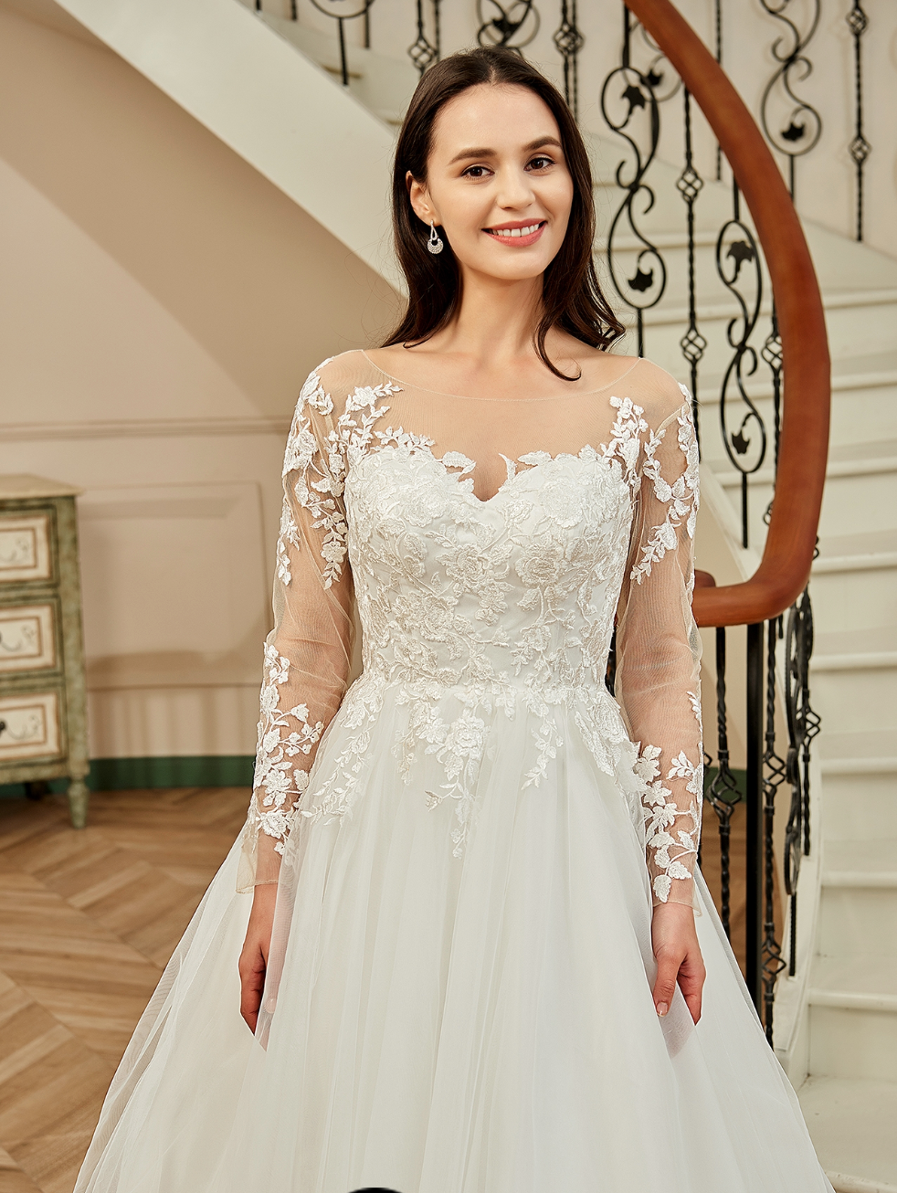 Wedding Dress Illusion Long Sleeve Chapel Train Lace, Fall in love with this long sleeve A-line wedding dress. Vintage inspired lace applique adorn the illusion bodice and sprinkles down softly onto layers of tulle skirt. A chapel length train trimmed with hem lace completes the look. Dress shown in ivory