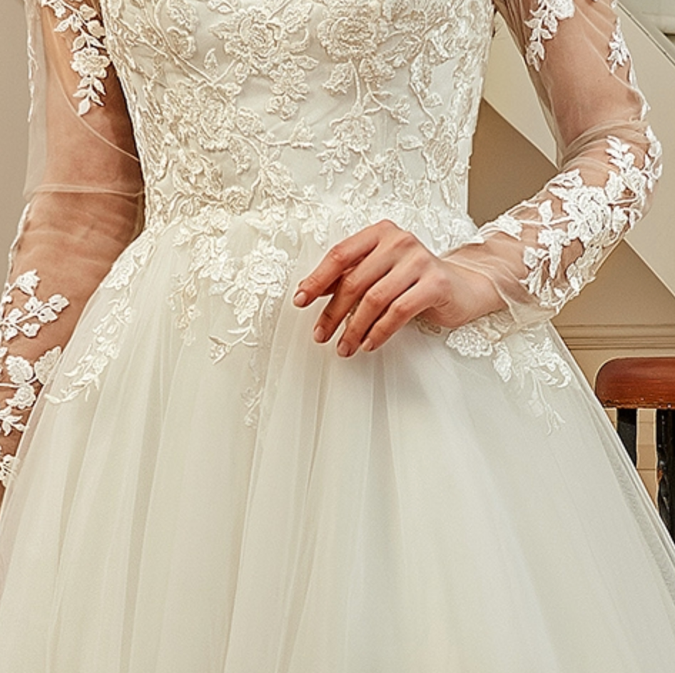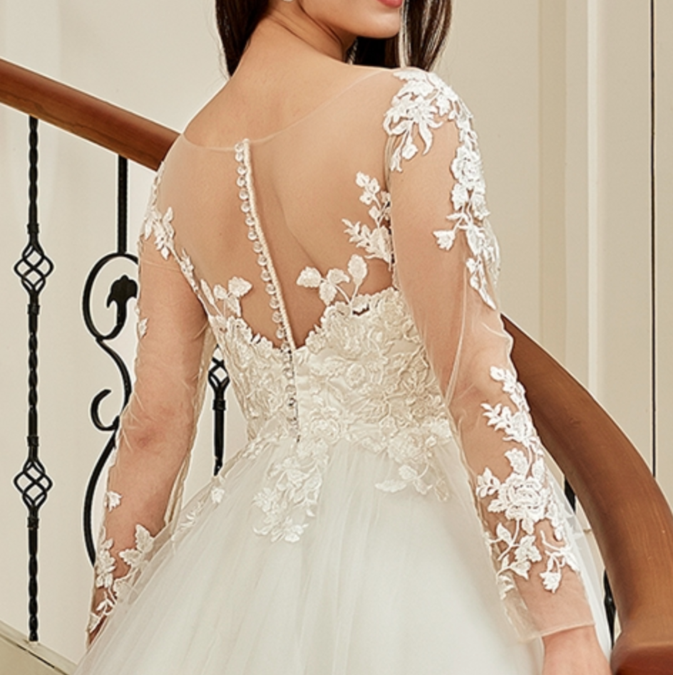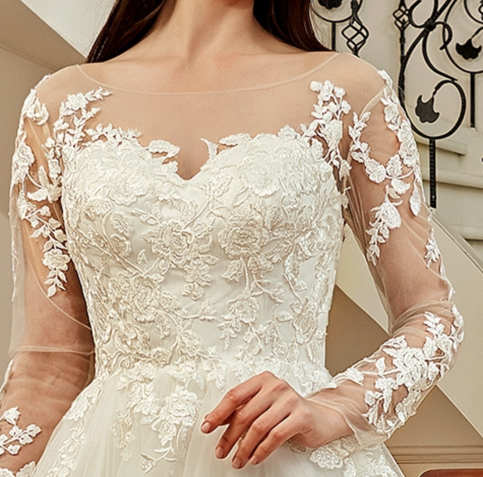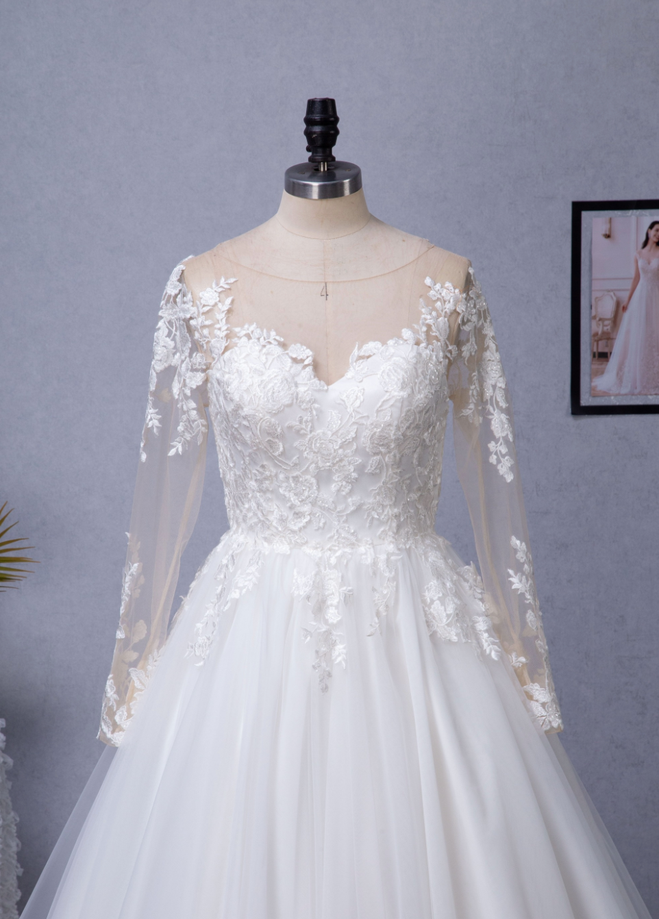 Wedding Dress Illusion Long Sleeve Chapel Train Lace, Fall in love with this long sleeve A-line wedding dress. Vintage inspired lace applique adorn the illusion bodice and sprinkles down softly onto layers of tulle skirt. A chapel length train trimmed with hem lace completes the look. Dress shown in ivory