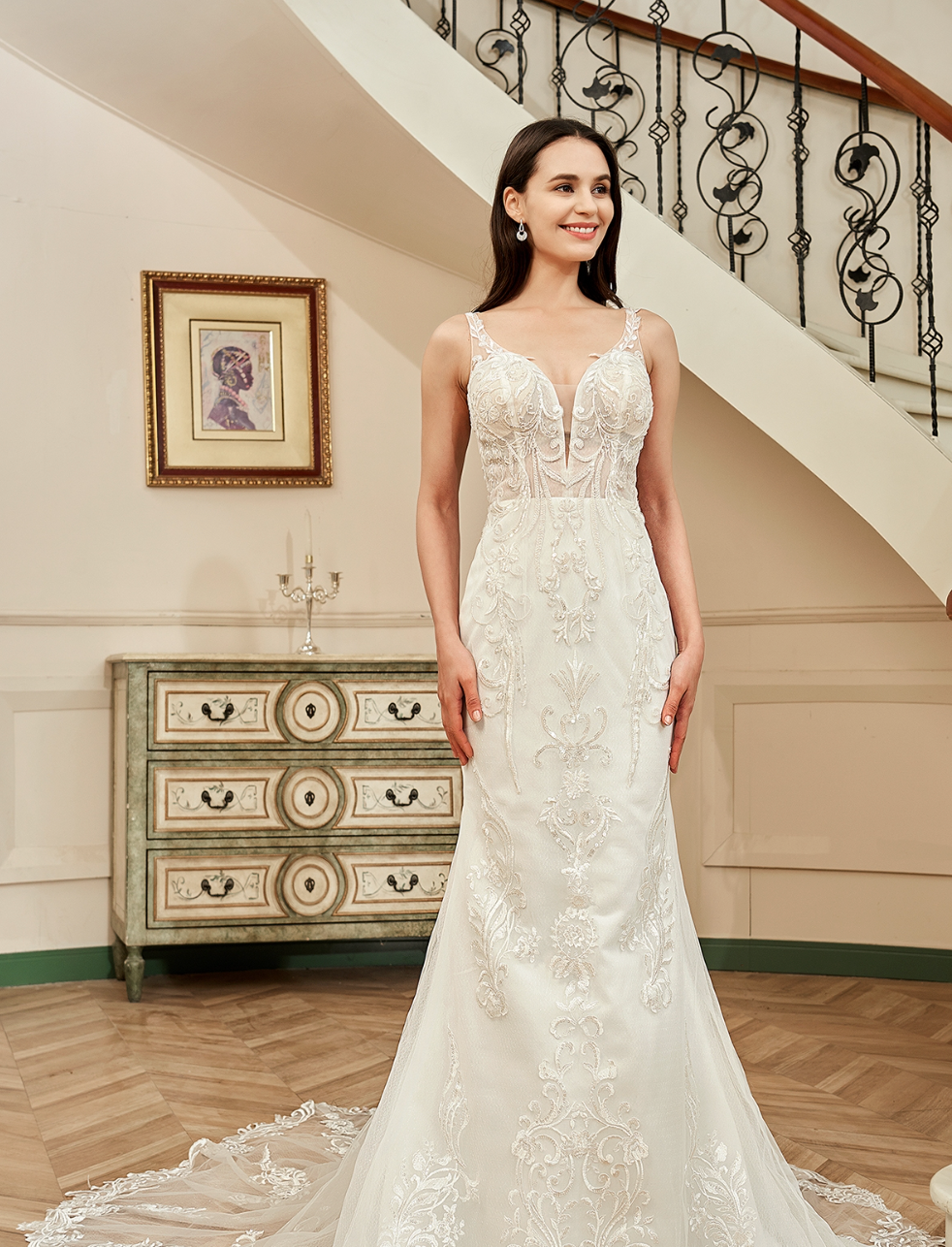 People ask about the risk of buying online and not being able to try on the dress. We recommend you go to a local bridal shop to try on wedding dress styles to find your dream dress style, then shop online for a wider selection and with better knowledge and understanding of what style dress looks best on you. Use the online model photos as a guide. Some models will be holding a dress out or the full train is spread out, this is to show the dress detail to the customer.