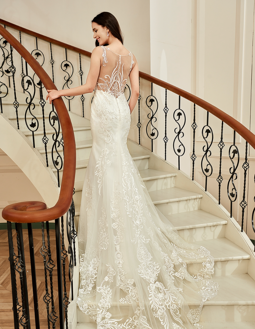 Wedding Dress Illusion Back With Long Lace Tulle Train