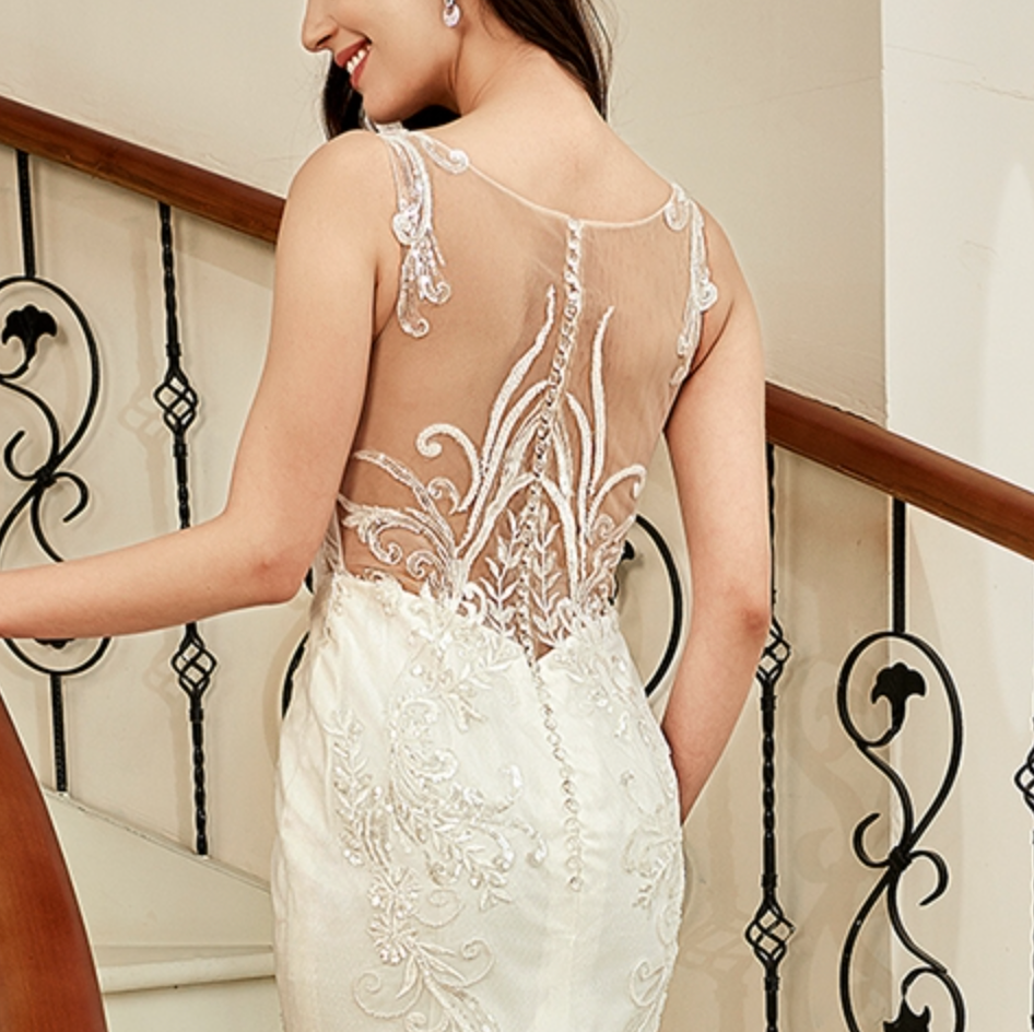 Wedding Dress Illusion Back With Long Lace Tulle Train, The plunging illusion V-neckline wedding dress features an allover beaded and sequined lace bodice that gently transitions into the fit and flare tulle skirt. Complete with a dreamy illusion back trimmed in covered crystal buttons and a long court length tulle train adorned with unique symmetrical lace appliques make this the perfect style for a bride. Dress shown in ivory