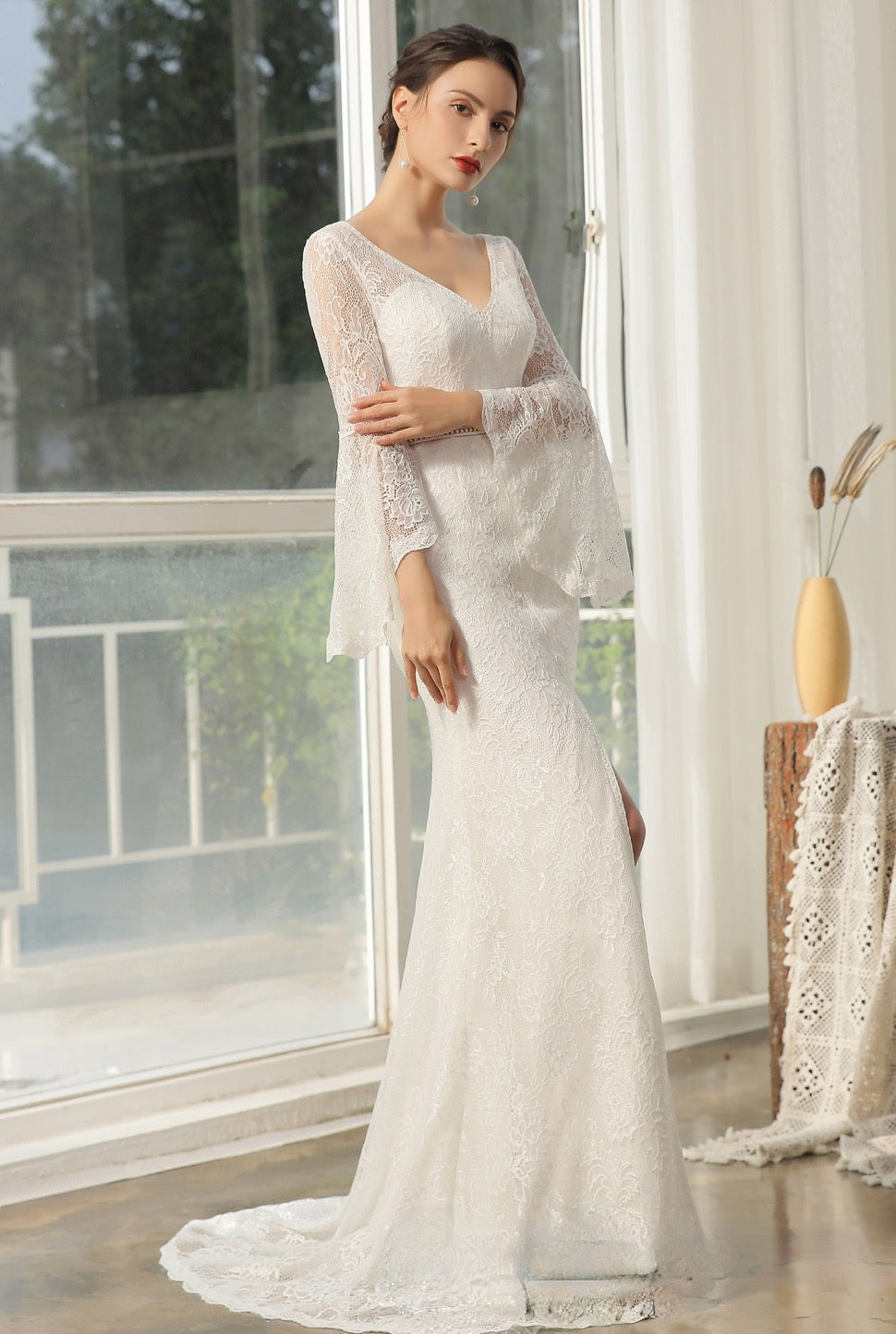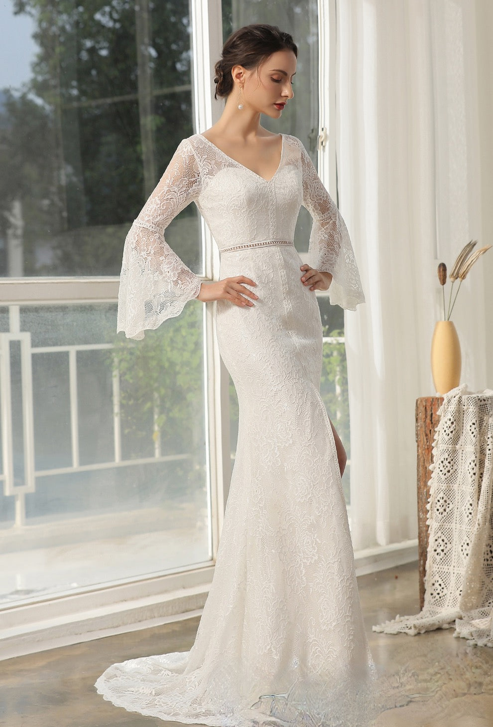 Wedding Dress Lace High Split Bridal Gown A Line, This stunning long sleeve bridal gown features frosted lace and beautiful poetic sleeves on an intricately designed wedding dress. The V neckline and flirting high split complements the fit and flare silhouette of this bridal gown. A open back and intricate hemline complete the look. Dress shown in ivory.