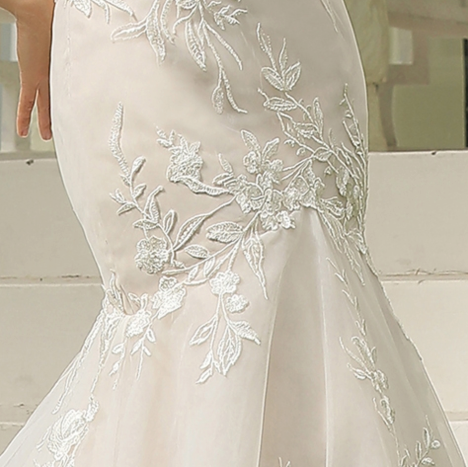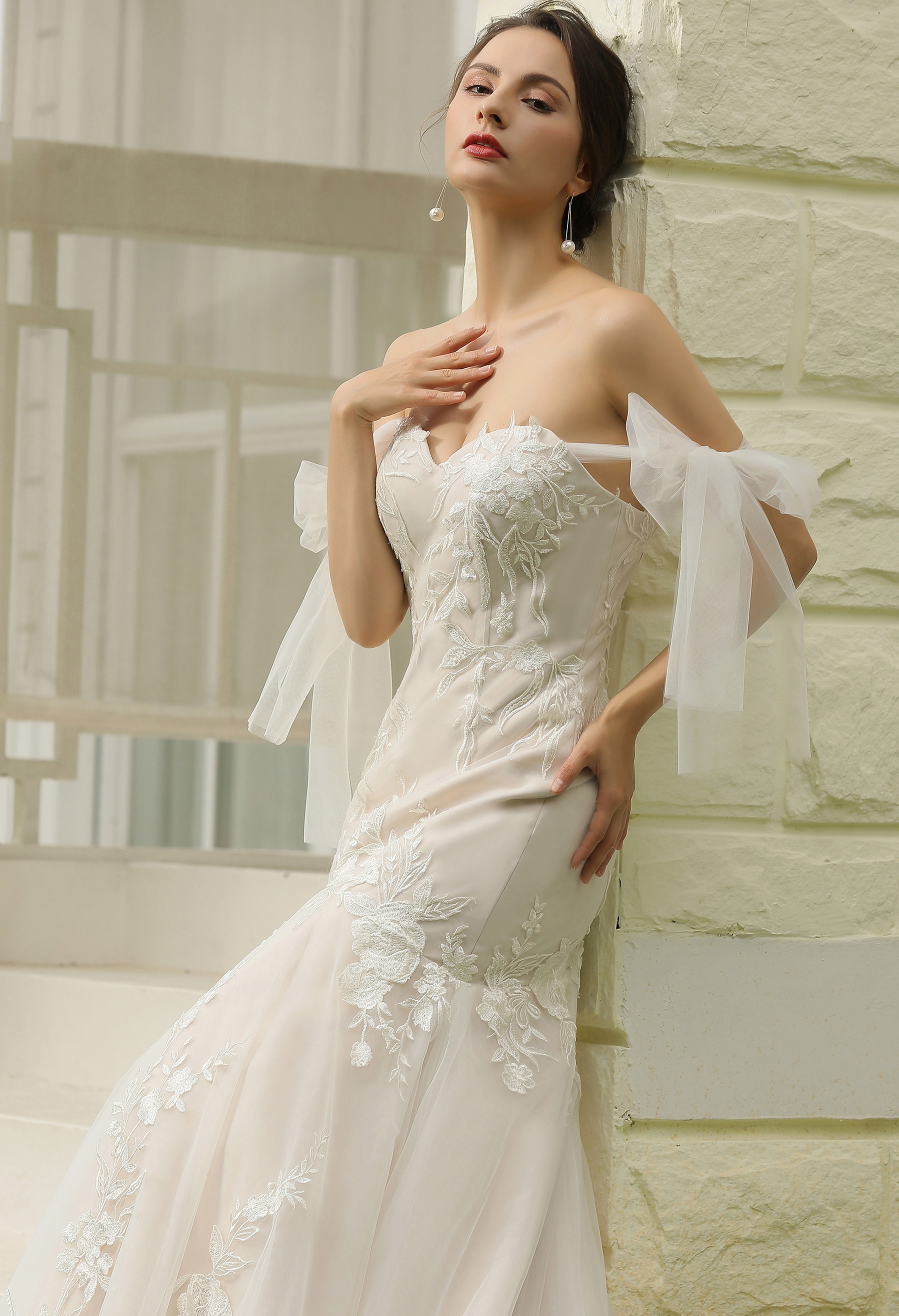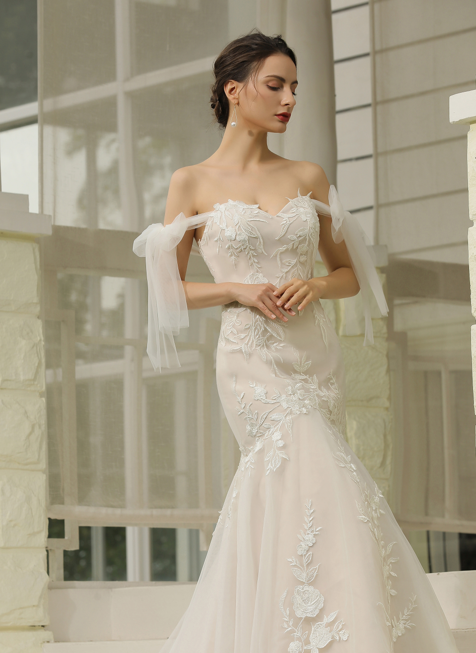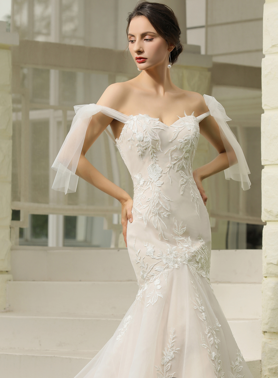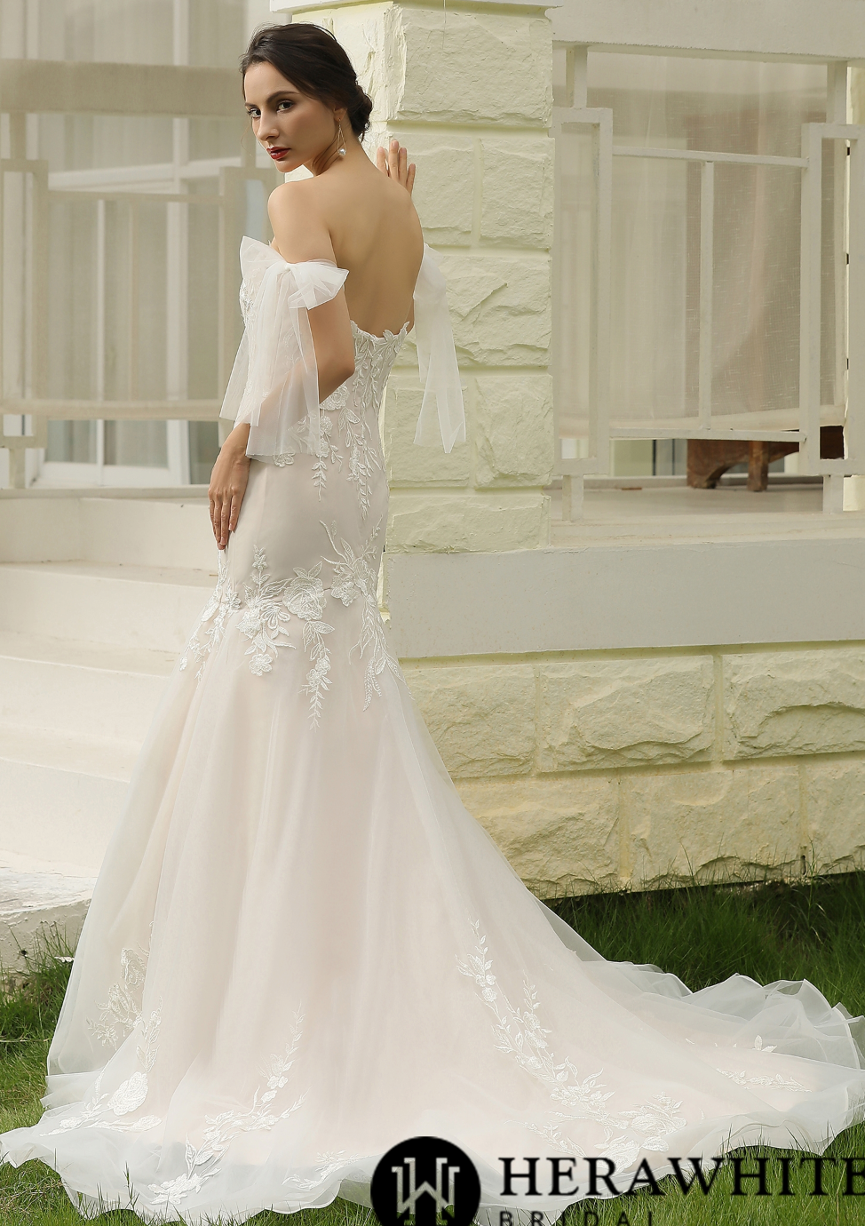 Wedding Dress Lace Mermaid With Detachable Tulle Straps, Frosted flower appliqués accent the romantic sweetheart neckline on our bridal gown. This gown can be worn with or without the detachable tulle straps,A net mermaid silhouette with wide hemline creates a classic bridal look. Dress shown in ivory/pink.