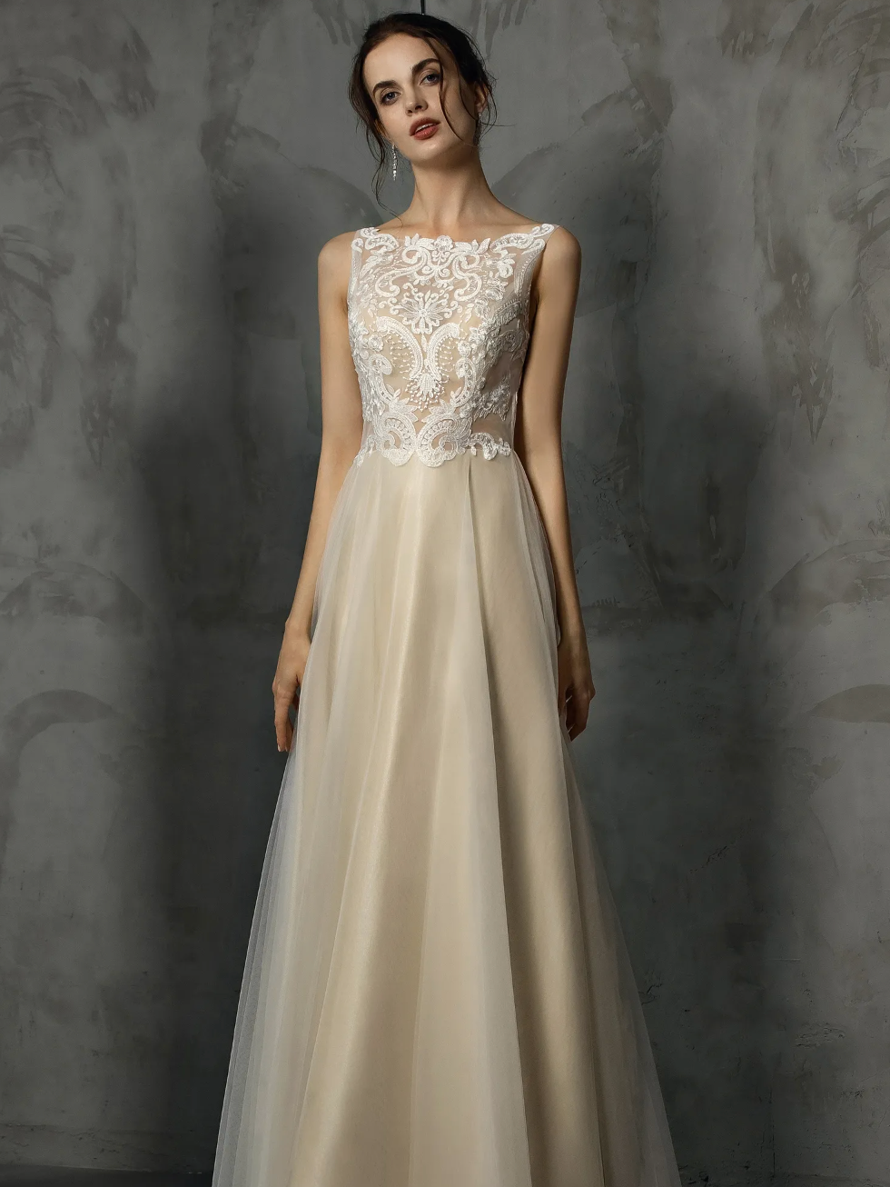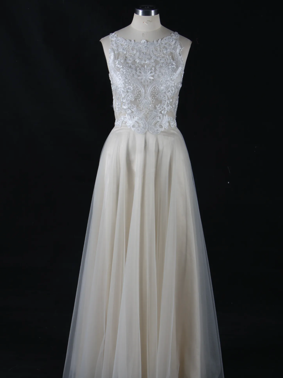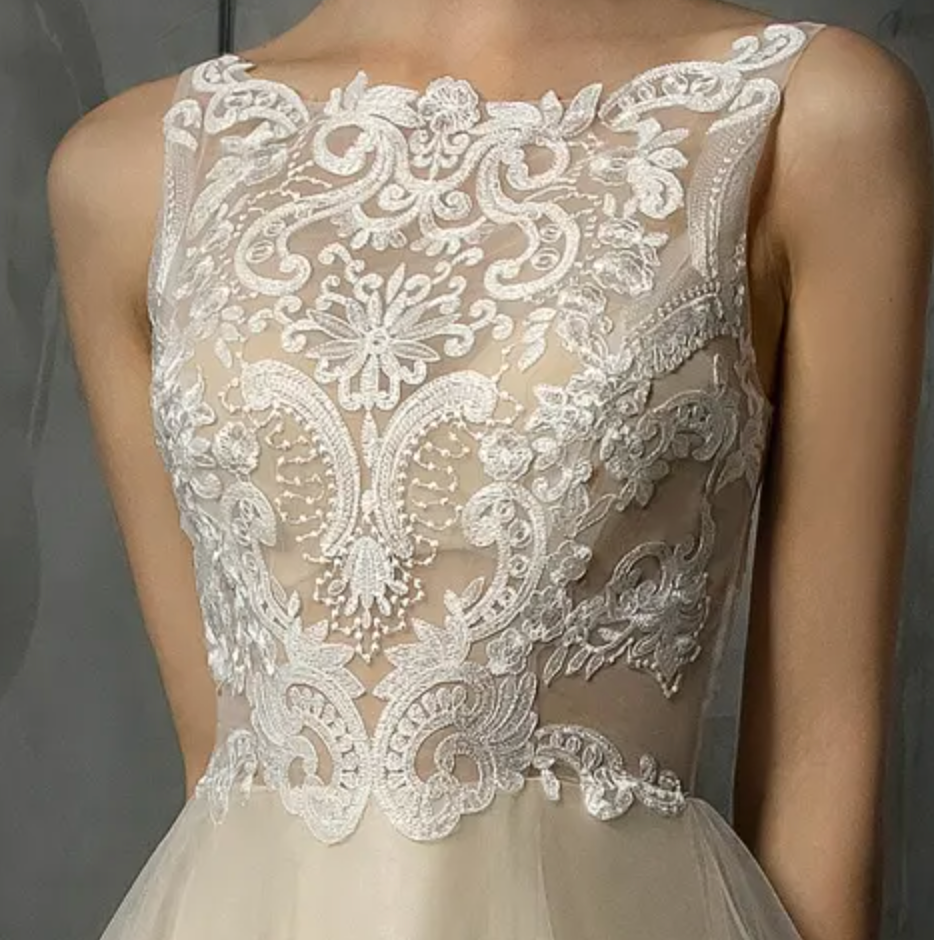 Frosted Lace Wedding Dress A-Line Tulle Illusion Back Bridal Gown, the bridal gown is accented by a bateau, gorgeous neckline and frosted lace appliquès adorn the bodice of this beautiful wedding gown. A plunging illusion back adds the perfect touch of sparkle to complete the look of this bridal gown with an A-line silhouette. Dress shown in ivory/champagne