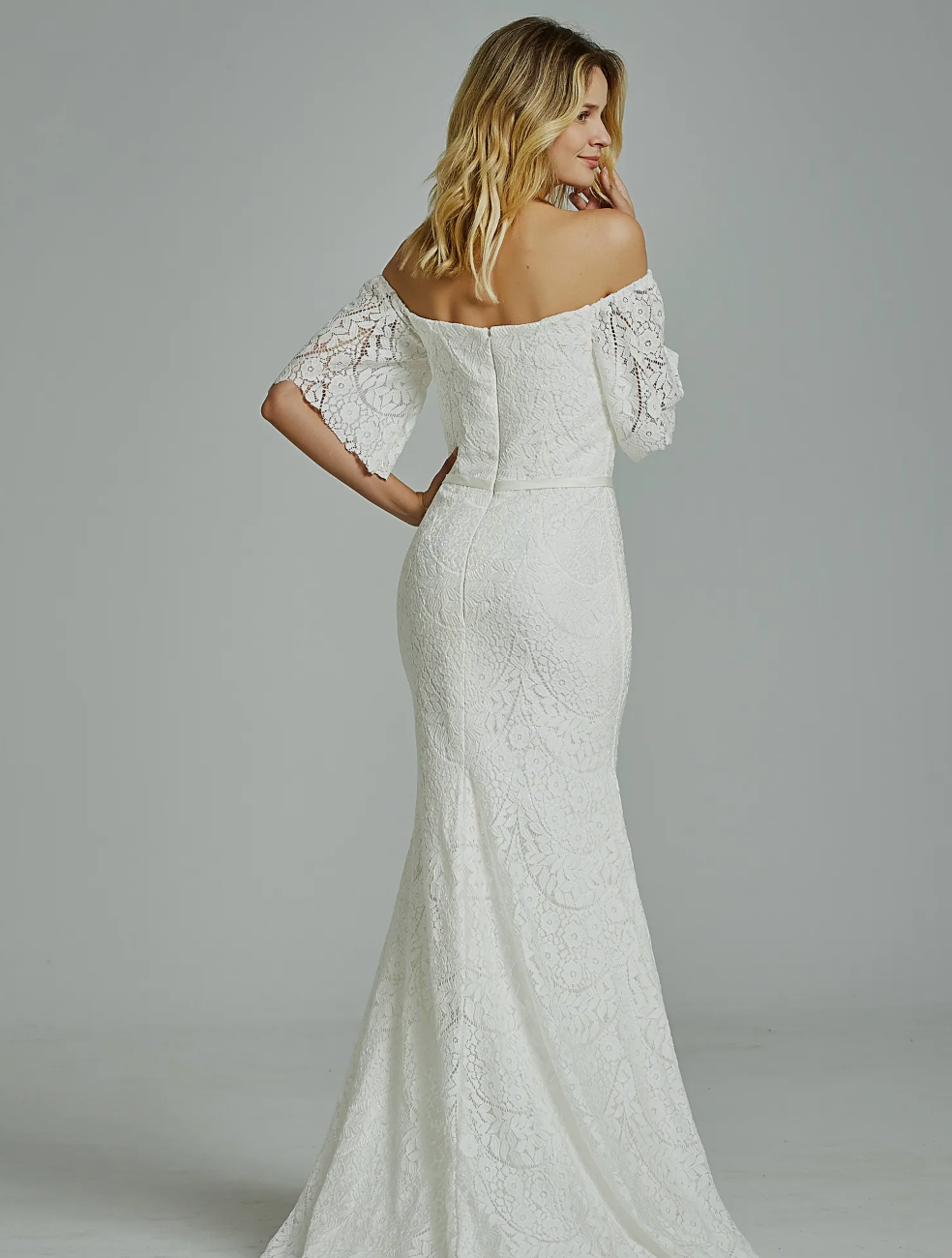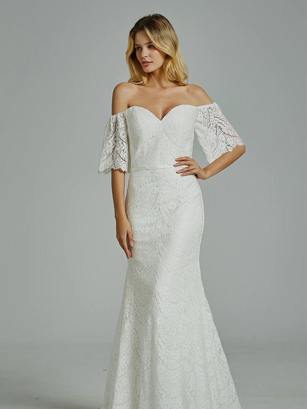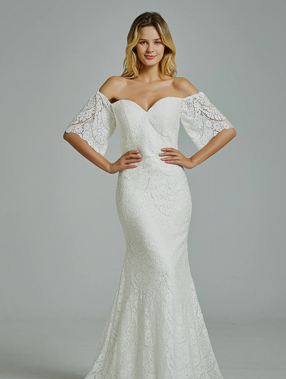 Sweep Train Wedding Dress Boho Lace Spandex Satin Bridal Gown, this elegant off the shoulder bridal gown features beautiful lace on an designed bridal gown, strapless neckline with sheath silhouette skirt. Finest soft texture lace pours ending with a sweep train.