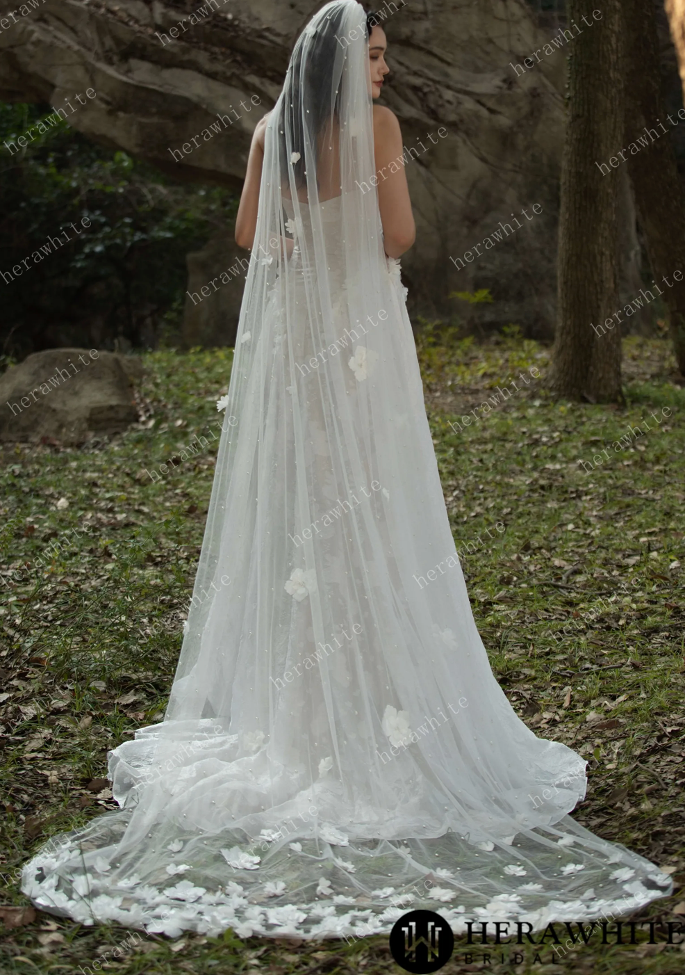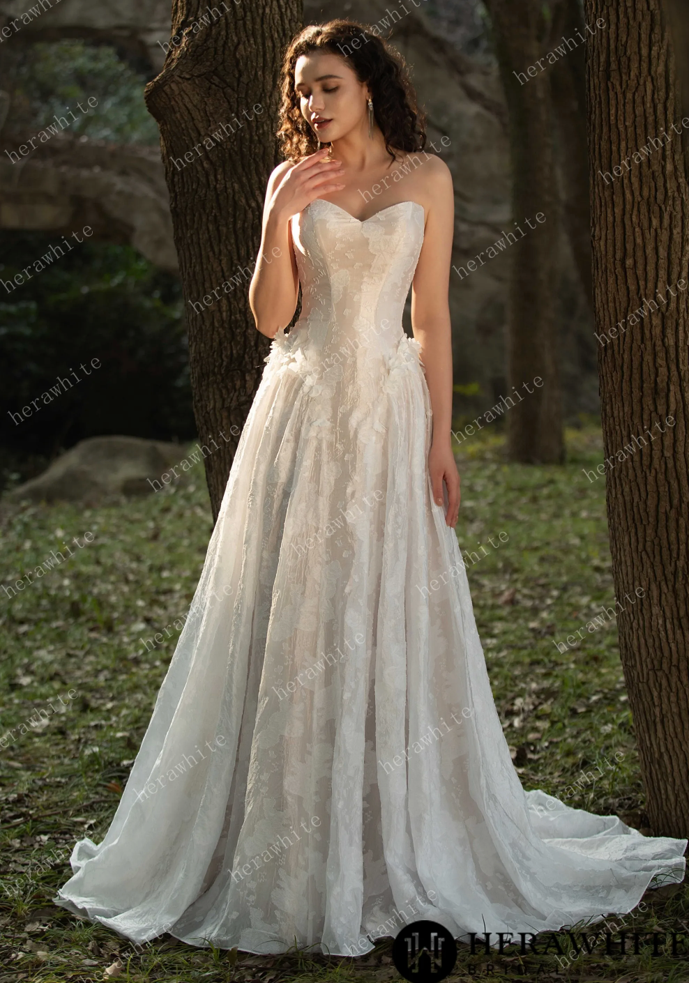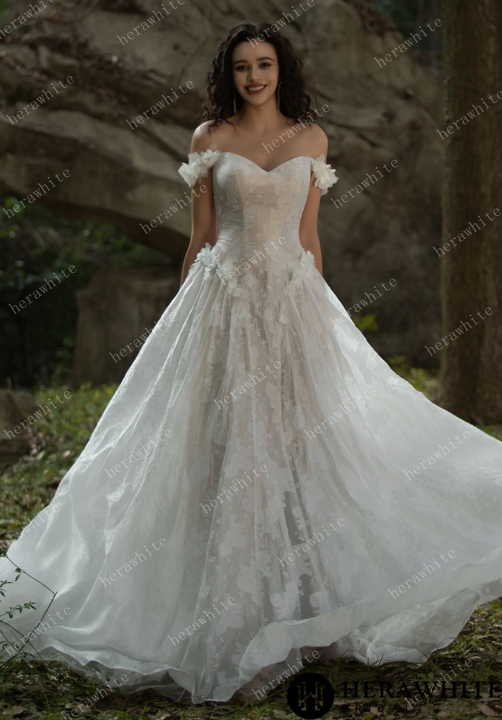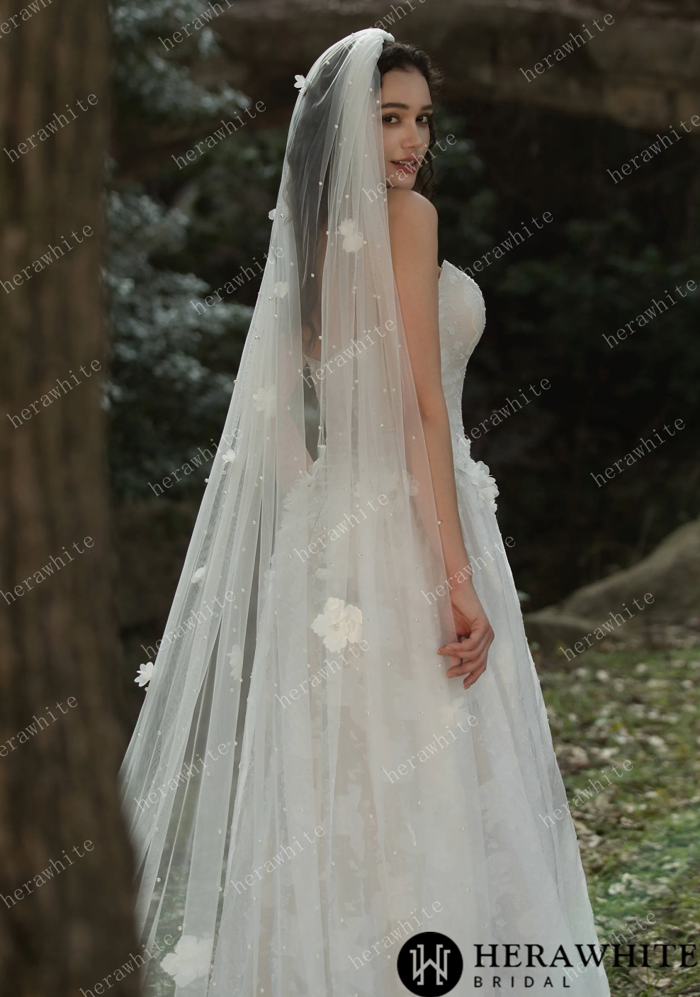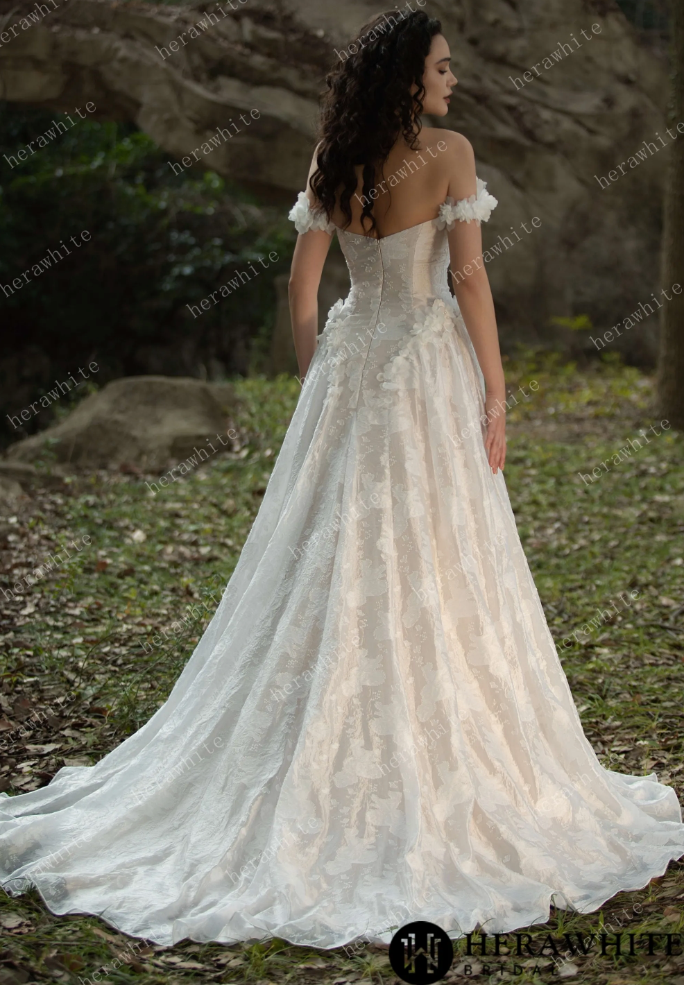 Wedding Dress 3D Flower Embellished Floral Jacquard Gown, Indulge in timeless elegance with this stunning floral jacquard gown. The basque waistline is artfully embellished with intricate 3D floral appliqués, adding a touch of delicate beauty. The luxurious jacquard fabric adds depth and texture, while the structured yet flowing silhouette exudes a regal and romantic feel. For those seeking a touch of grandeur, consider adding the optional 3D pearl floral cathedral veil, adorned with exquisite floral embellishments and pearly accents. Elevate your special occasion look with this sophisticated and fairytale-inspired gown.