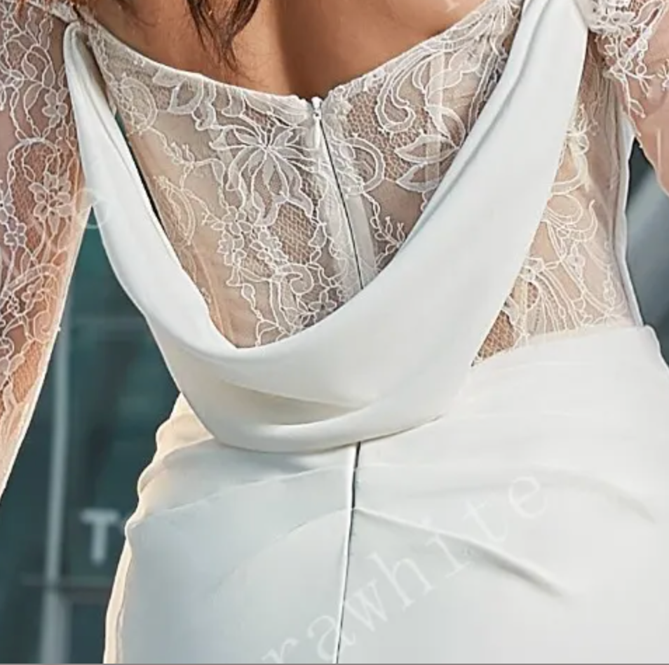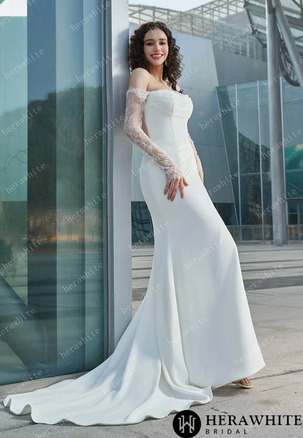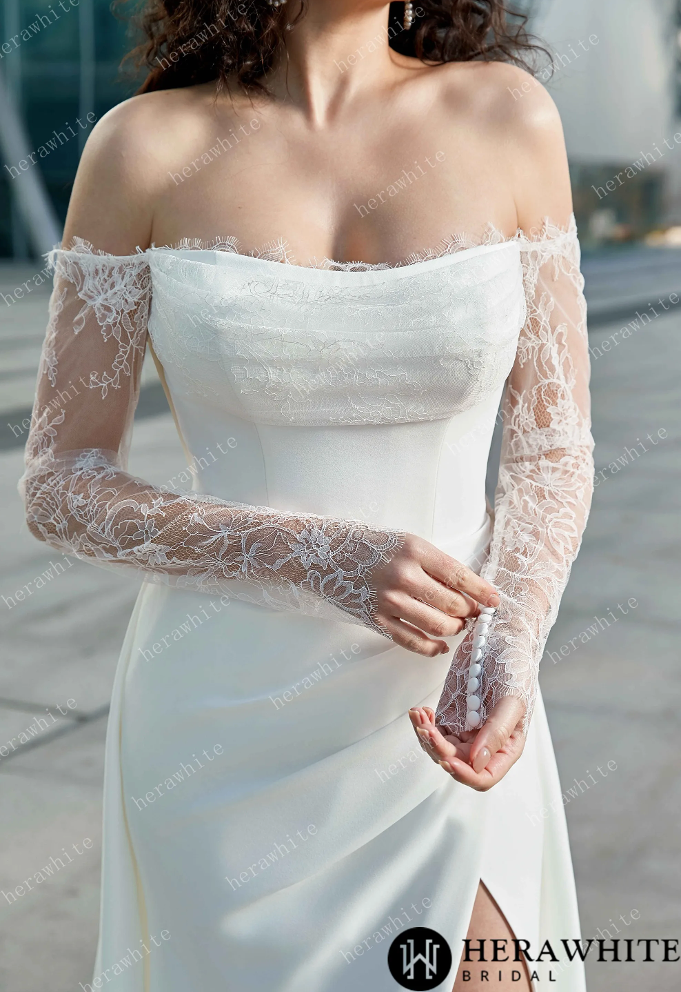 Wedding Dress Crepe A-line Bridal Gown, Experience the sophistication of this off-the-shoulder bridal gown with a sultry thigh-high slit. Showcasing a form-fitting style and elegant draping to enhance the waist, this dress is a modern take on traditional bridal fashion. The sheer lace sleeves add a delicate and feminine touch, while the sleek skirt flows gracefully. The detachable train, sold separately, allows for versatile styling options and is sure to be a stand-out feature.