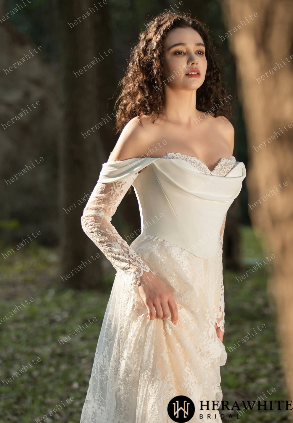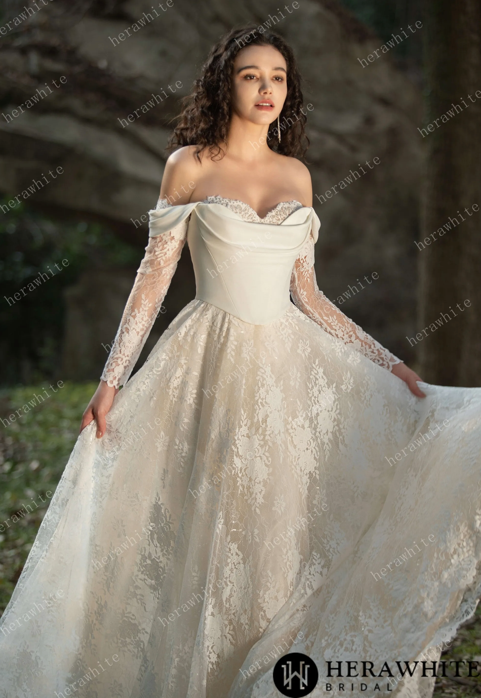 Wedding Dress Lace Sweetheart with Long Sleeves , Experience timeless charm and modern versatility with our Chantilly Lace Sweetheart Wedding Gown. The off-the-shoulder neckline and intricate lace detailing exude elegance, while long sleeves add sophistication. The detachable jacket offers dual styling options, perfect for a transitioning look from traditional ceremony to sleek, figure-hugging reception. Lightweight and comfortable, this gown is ideal for brides seeking adaptability and drama.