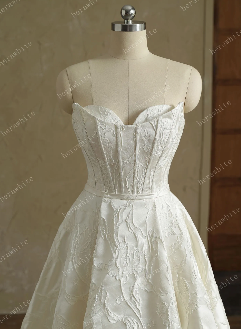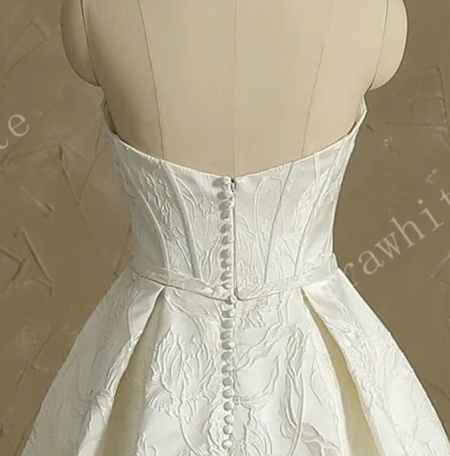 Wedding Dress Satin Sleeveless Ivory A Line Split Gown, Indulge in an exquisite experience with the ultimate choice for a fashion-forward bride. This strapless wedding dress boasts a draped sweetheart neckline, a boned bodice, and a row of petite buttons that enhance the waistline. The soft satin pleated pattern from the waist extends to create a delicate A-line silhouette, while a thigh-high slit adds a touch of allure. Available in plus sizes, this elegant masterpiece will certainly turn heads at your wedding.