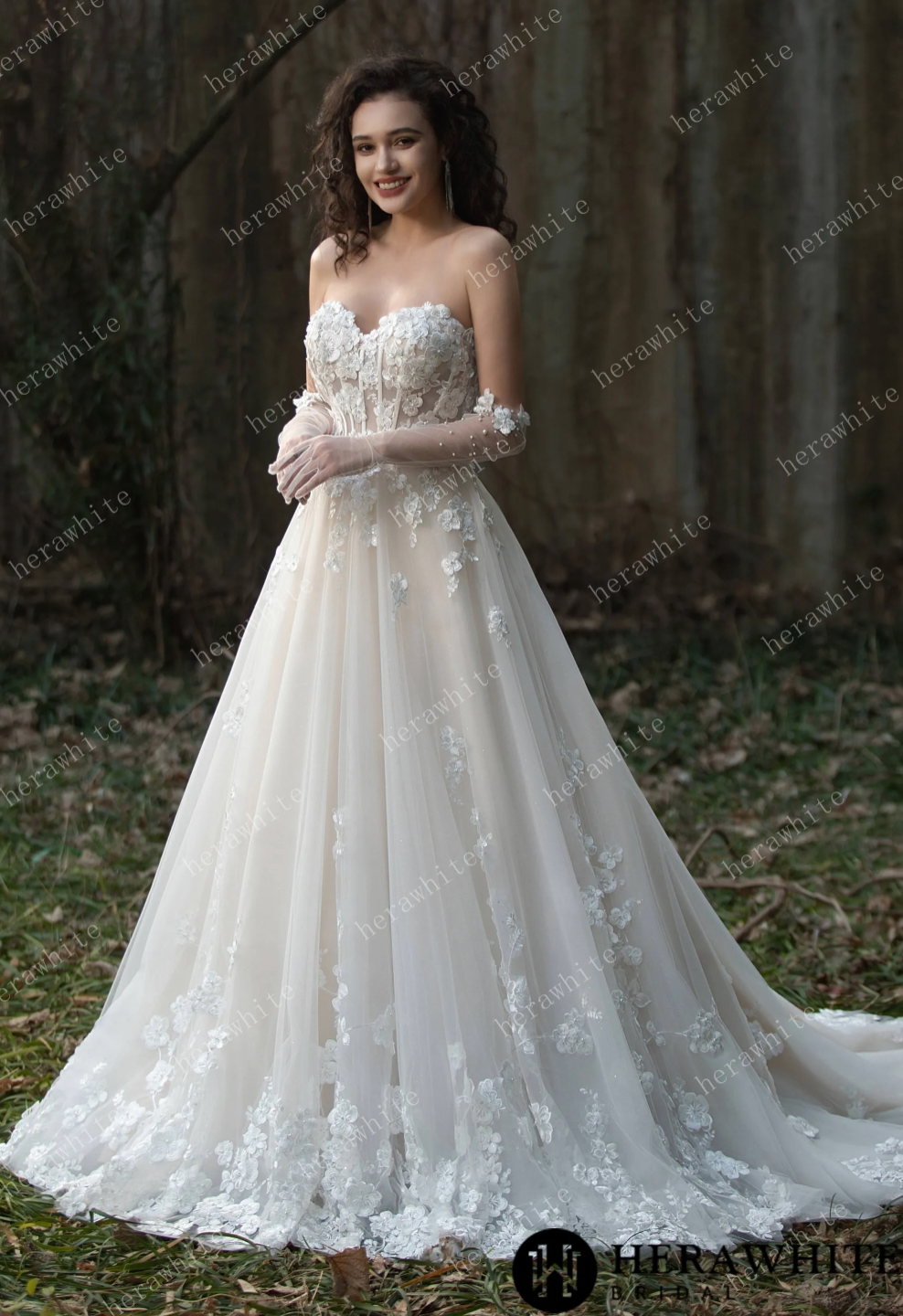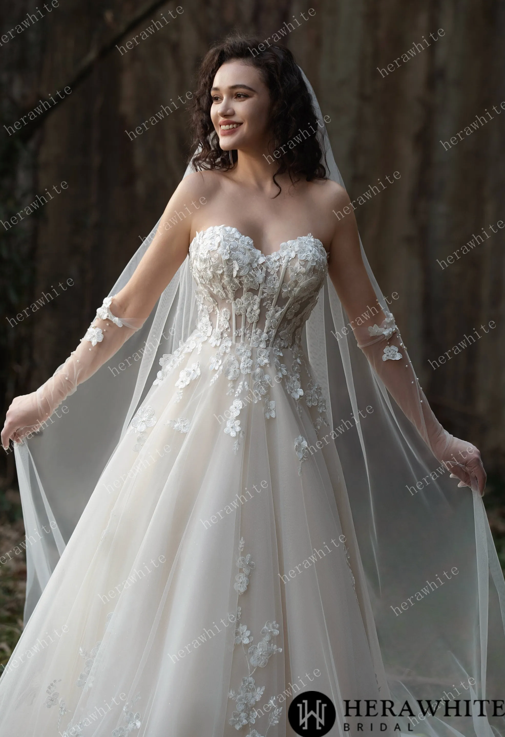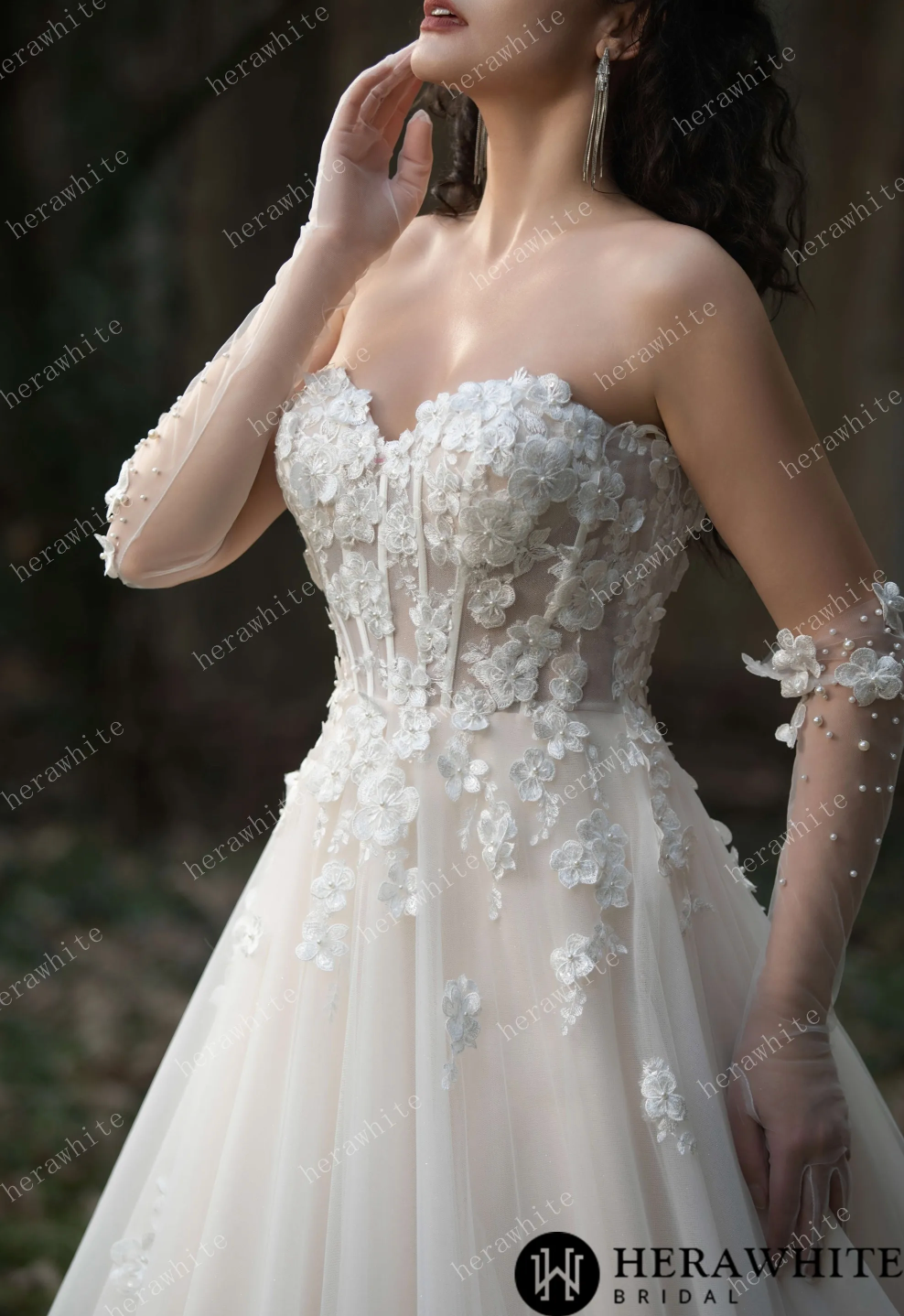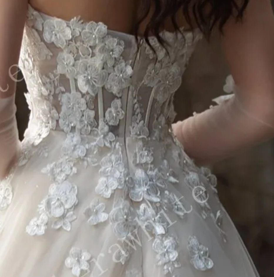 Wedding Dress Strapless Gown with 3D Embroidery Flowers, Experience a fairytale with this stunning strapless tulle wedding ball gown, decorated with intricate 3D embroidery flowers for a romantic and ethereal feel. The layers of soft tulle add volume and create a dreamy silhouette, making it the ideal gown for a magical wedding day. Elevate your bridal look with a pair of matching pearl gloves and a cathedral veil adding an elegant touch to your overall ensemble.