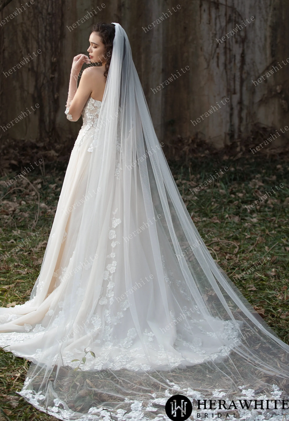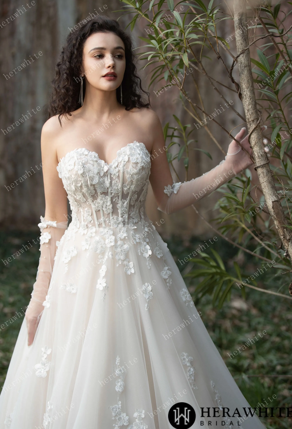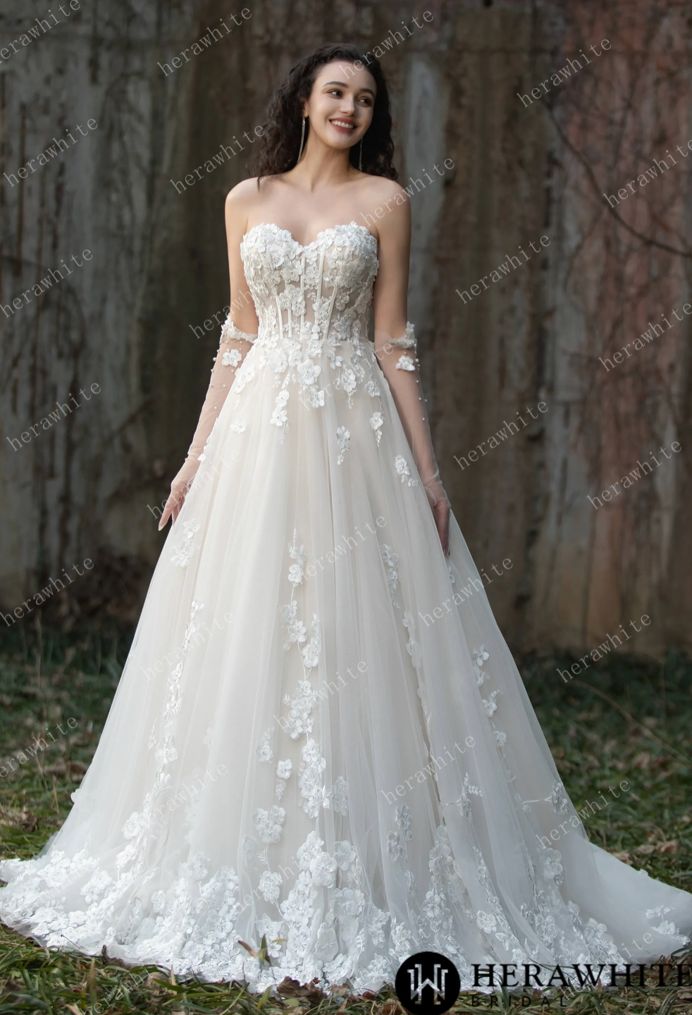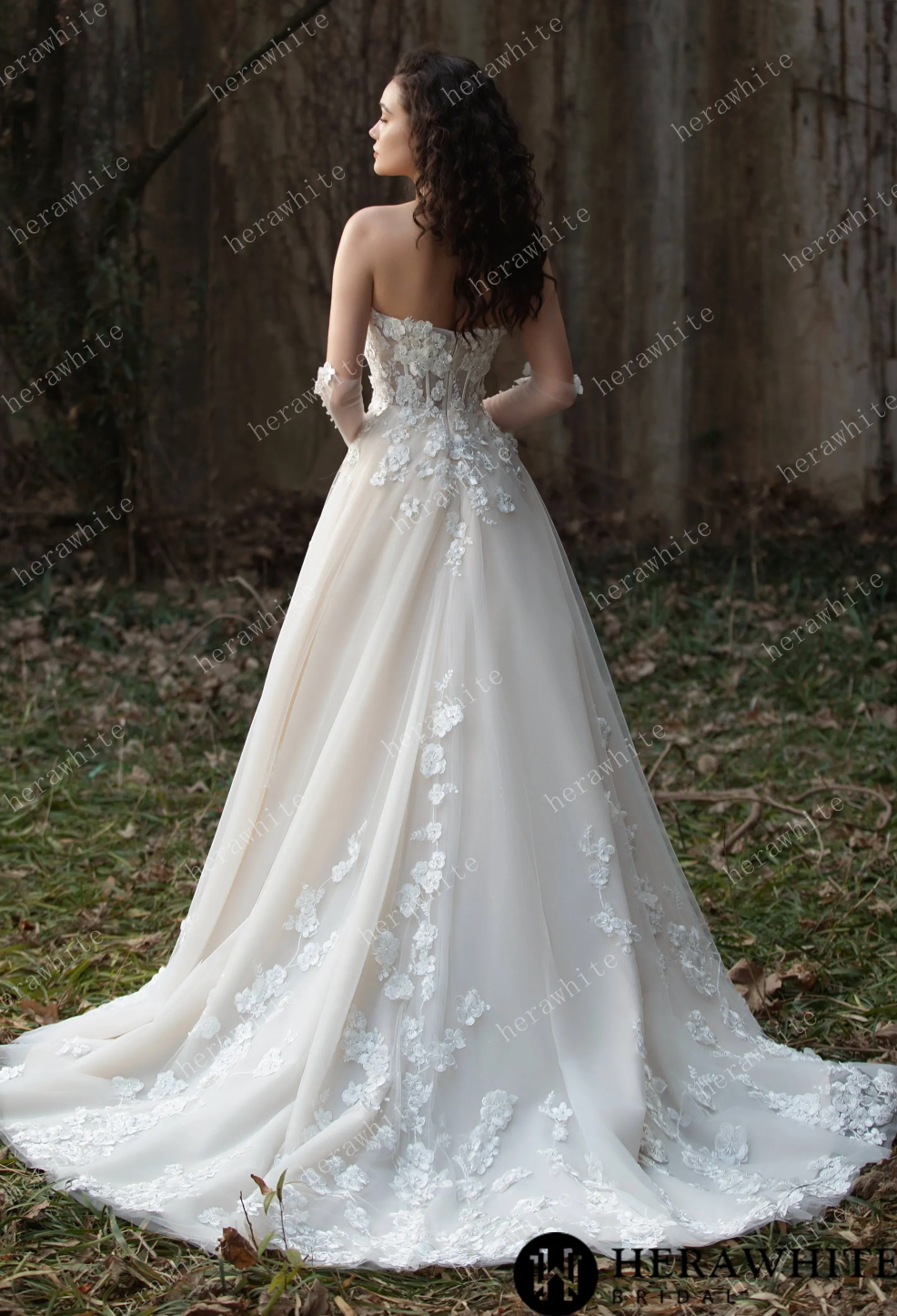 Wedding Dress Strapless Gown with 3D Embroidery Flowers, Experience a fairytale with this stunning strapless tulle wedding ball gown, decorated with intricate 3D embroidery flowers for a romantic and ethereal feel. The layers of soft tulle add volume and create a dreamy silhouette, making it the ideal gown for a magical wedding day. Elevate your bridal look with a pair of matching pearl gloves and a cathedral veil adding an elegant touch to your overall ensemble.