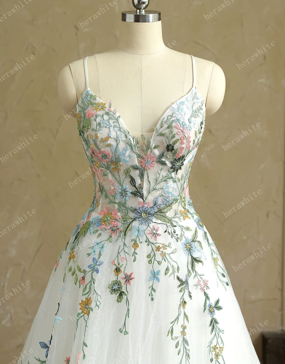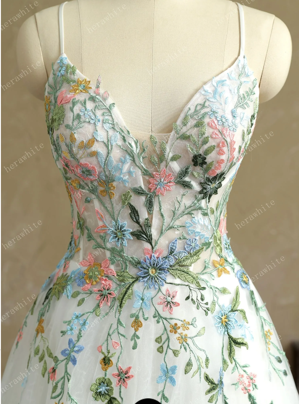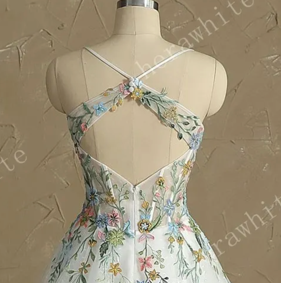 Wedding Dress V Neck Spaghetti Straps with Colorful Lace