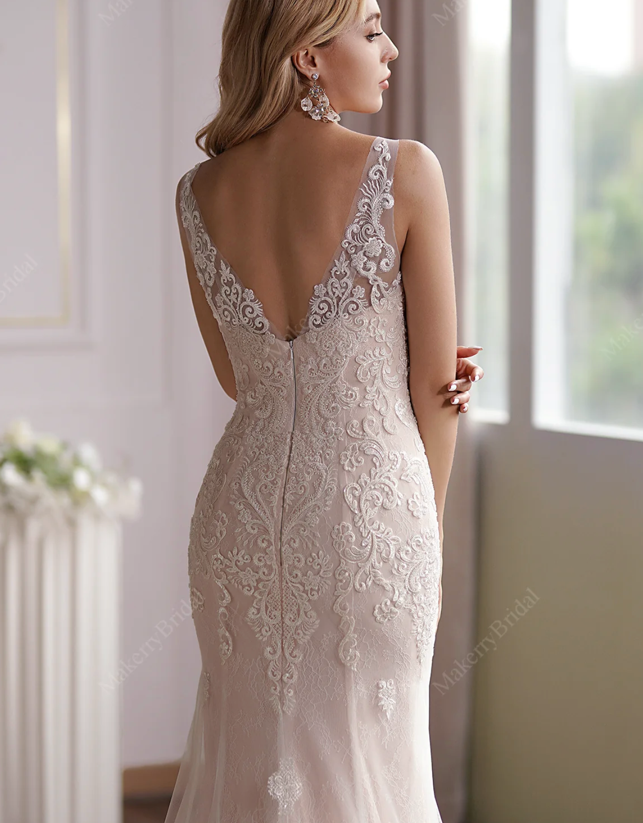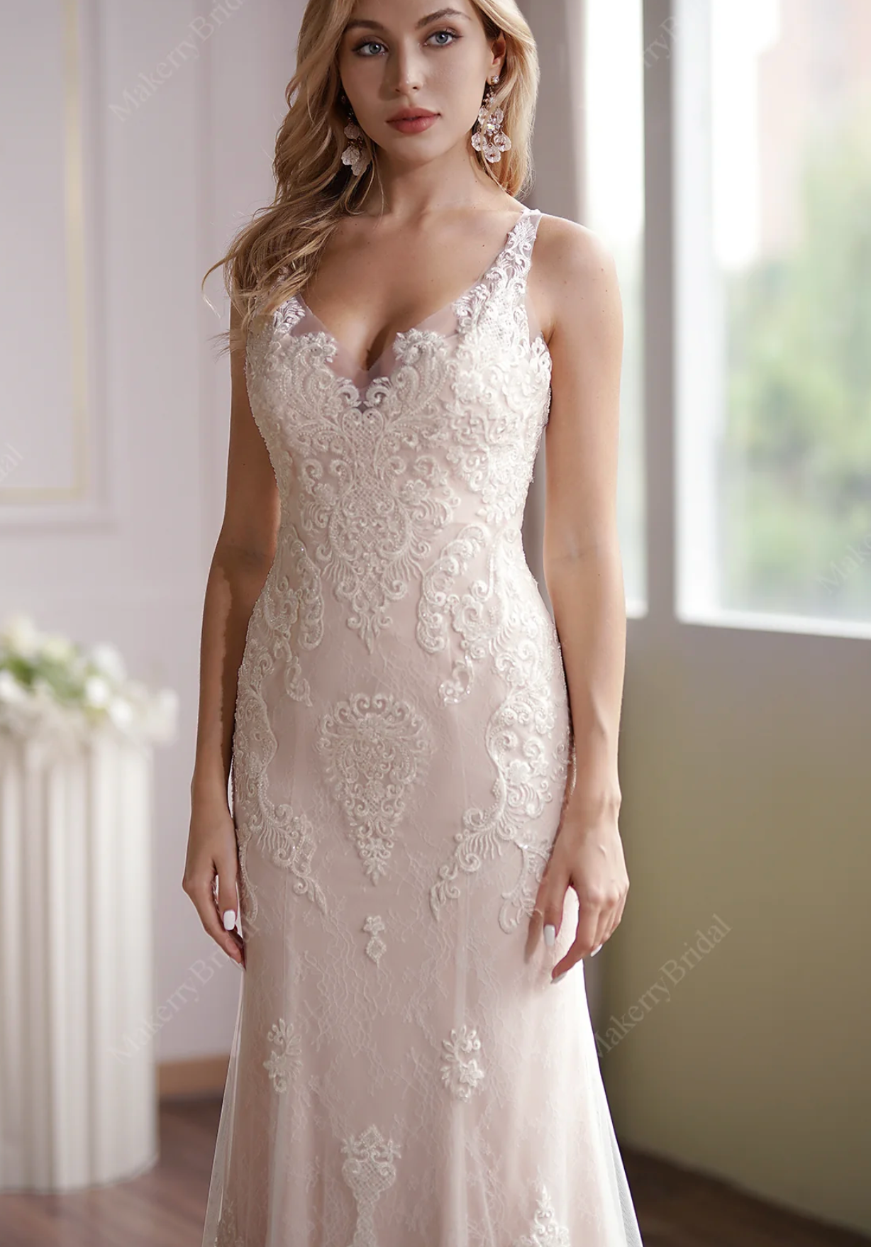 Wedding Dress Blush Beaded Lace Tulle Mermaid Bridal Gown, Floral beaded lace appliques cover along sleeveless V-neck bodice to fitted and flare mermaid long skirt symmetrically. The delicate floral motifs completes romance perfectly of this luxurious blush wedding gown. Dress shown in ivory/blush.