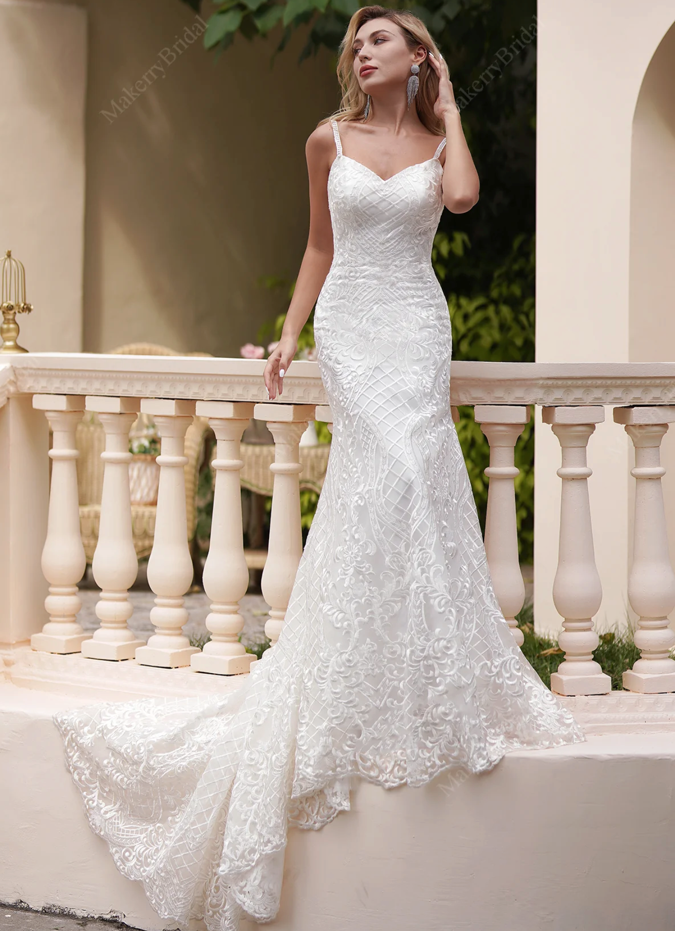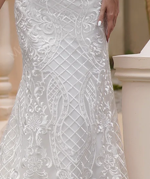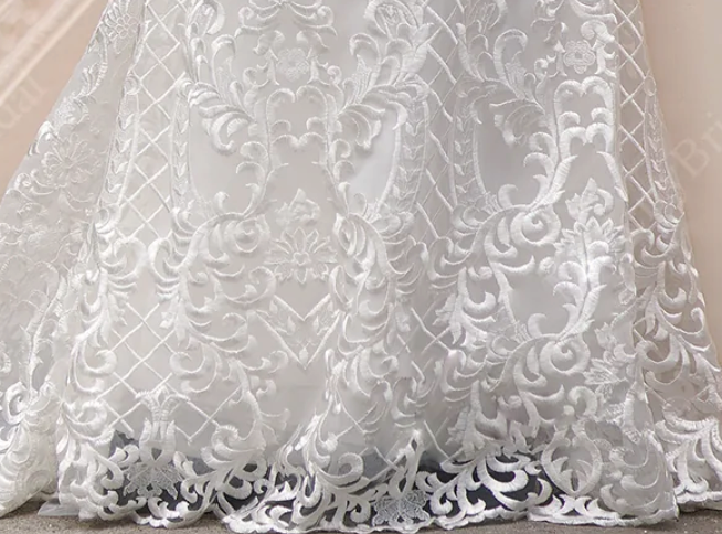 Wedding Dress Satin Tulle Bridal Gown With Train, Talk about a sleek stunner, this decked out dress has gorgeous details–from the all-over graphic lace design featuring intricate geometric shapes and linear patterns, embroidered in a rich multidimensional technique that makes them pop over the gown. While the clean sweetheart neckline, open back and detachable straps let you do all the shining up top. Dress shown in ivory/ivory.