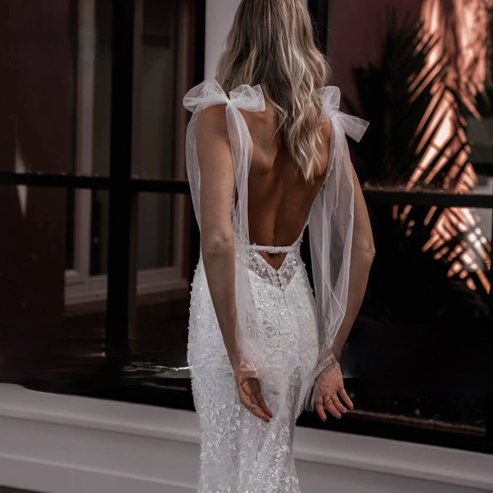 Vestido de novia de sirena con escote en V, encaje y espalda descubierta, de lujo, con cuentas y cola de corte