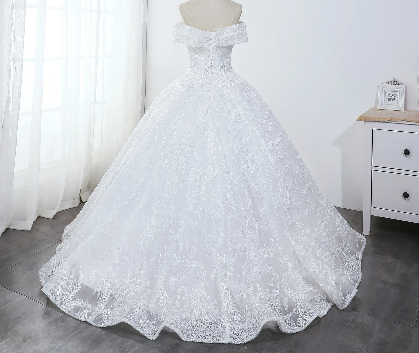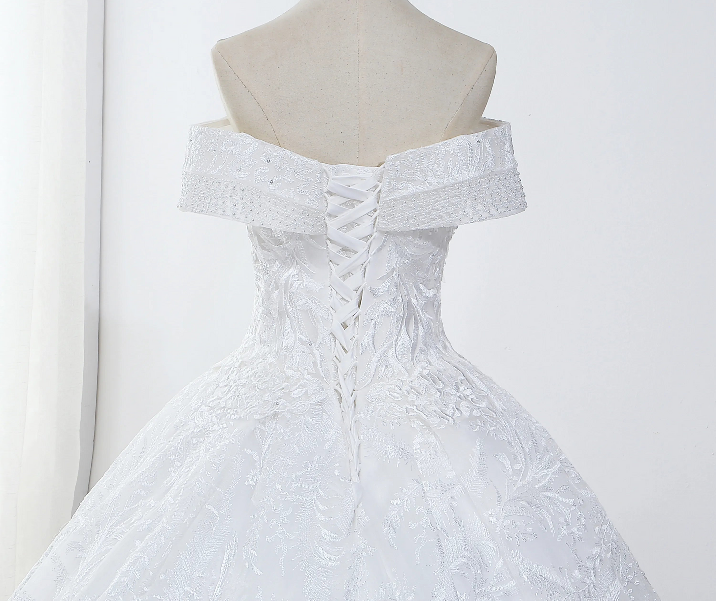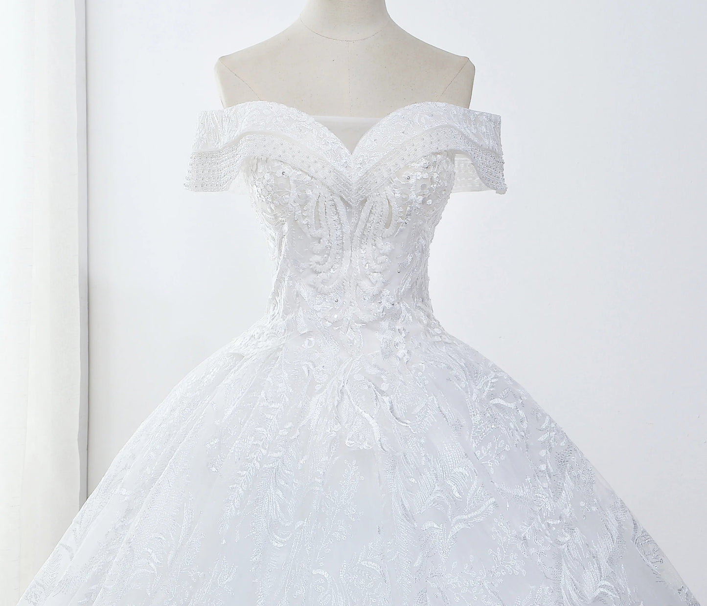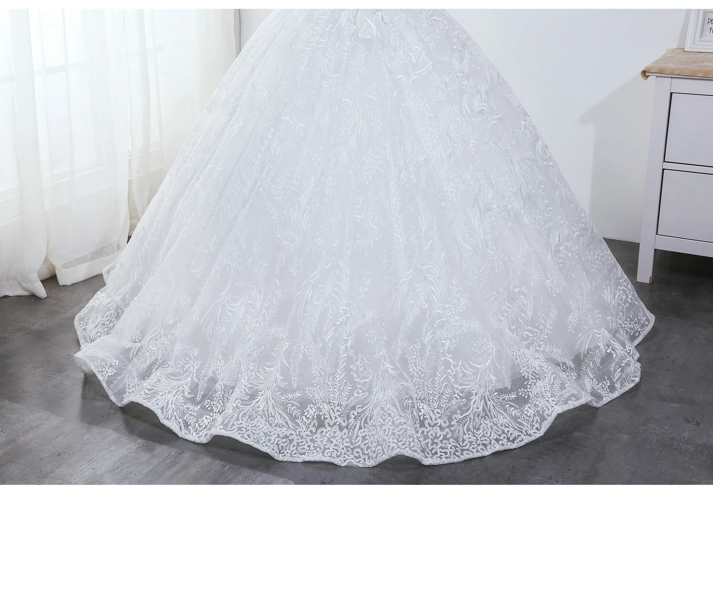 Experimenta la elegancia y la gracia de nuestro vestido de novia de encaje con cuentas y escote corazón. El hermoso encaje adorna las mangas onduladas con hombros descubiertos, el escote corazón y todo el vestido. Su estilo sin cola realza la simplicidad del diseño, mientras que la espalda con cordones permite un ajuste perfecto. ¡Siéntete como una princesa en tu día especial!