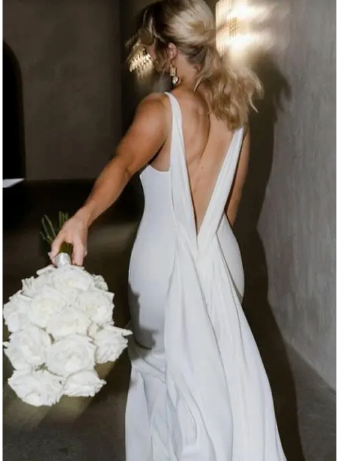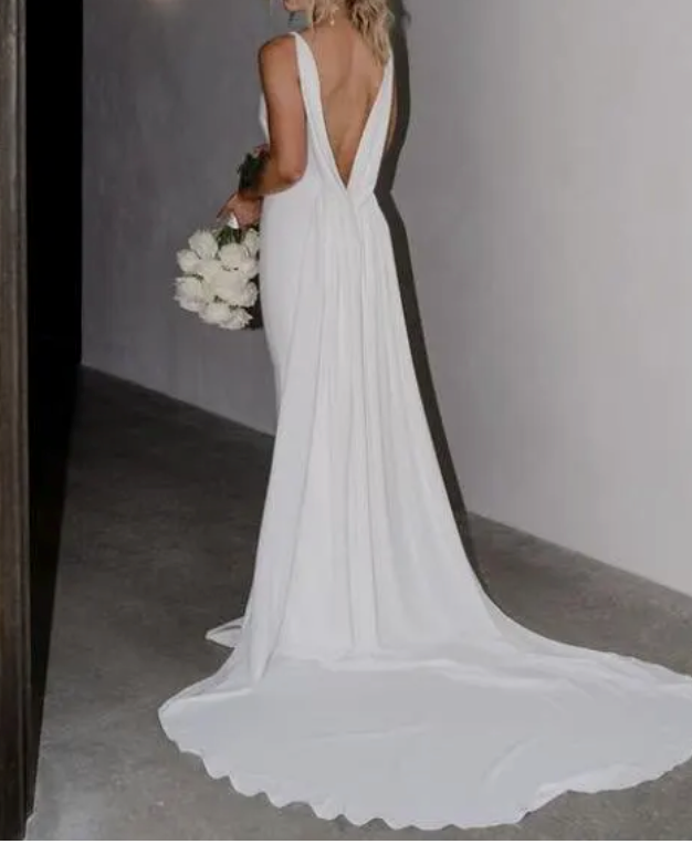 Libera tu elegancia interior con este exquisito vestido de novia sirena de crepé. Su impresionante diseño sin mangas presenta una cola desmontable y una atrevida espalda en V profundo, adornada con botones forrados que dan lugar a una elegante y elegante cola. La parte delantera luce un sencillo pero impactante escote en V con delicados tirantes y un sujetador incorporado para mayor comodidad. Experimenta el lujo puro mientras la deliciosa tela de crepé acaricia suavemente tu cuerpo.
