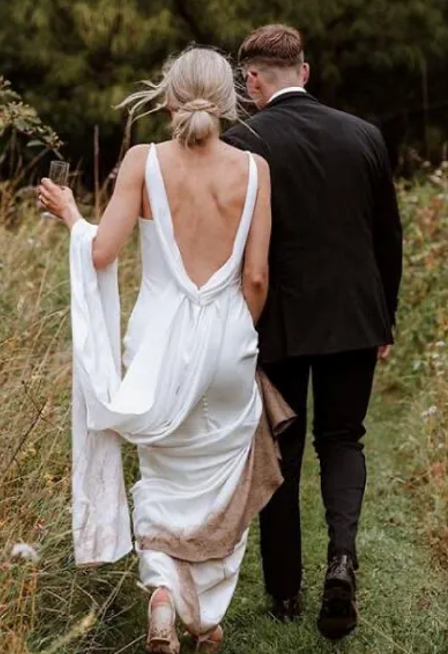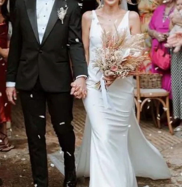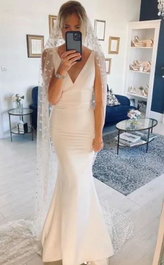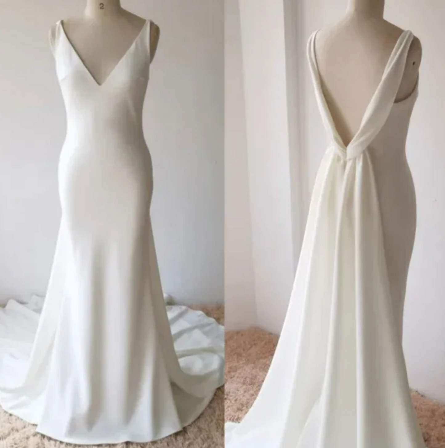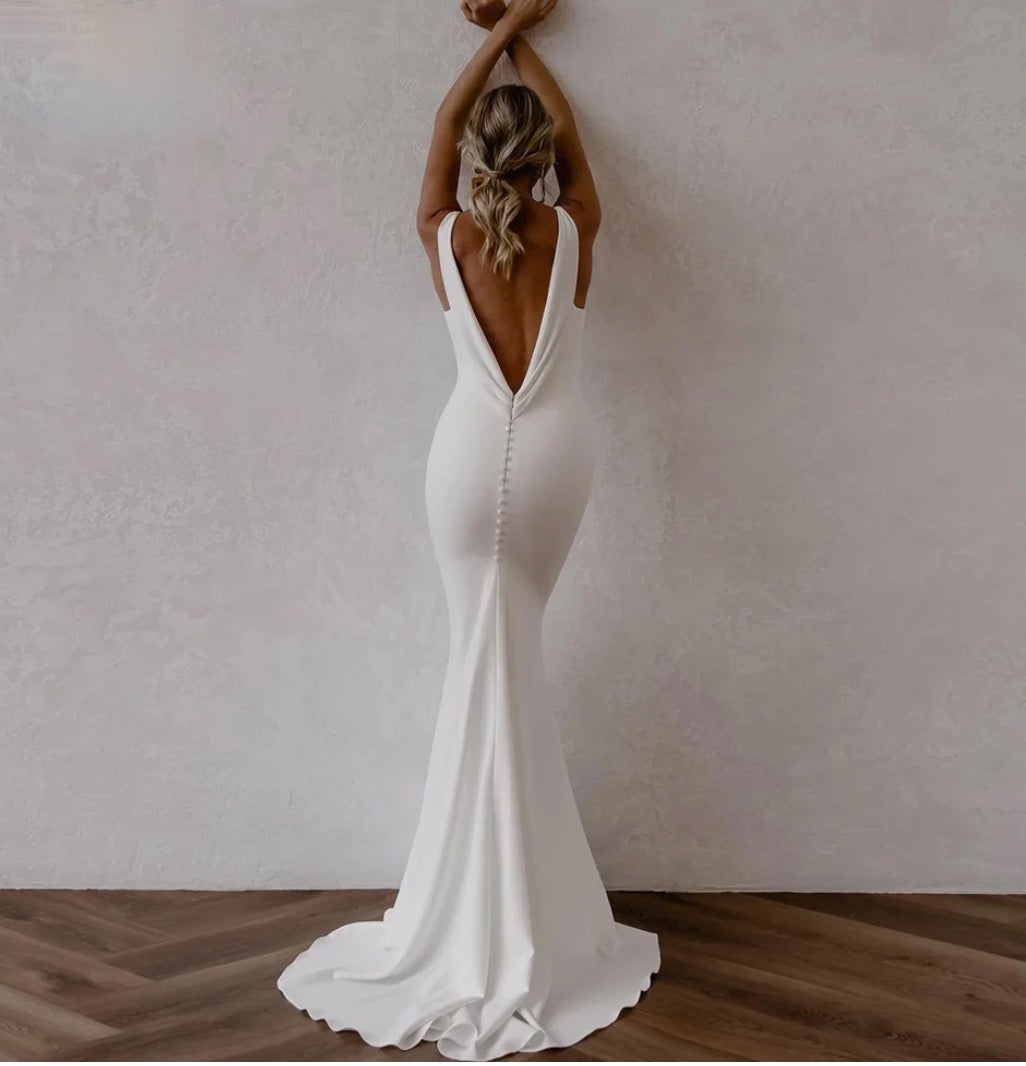Vestido de novia de sirena con escote en V profundo, cola desmontable y espalda abierta