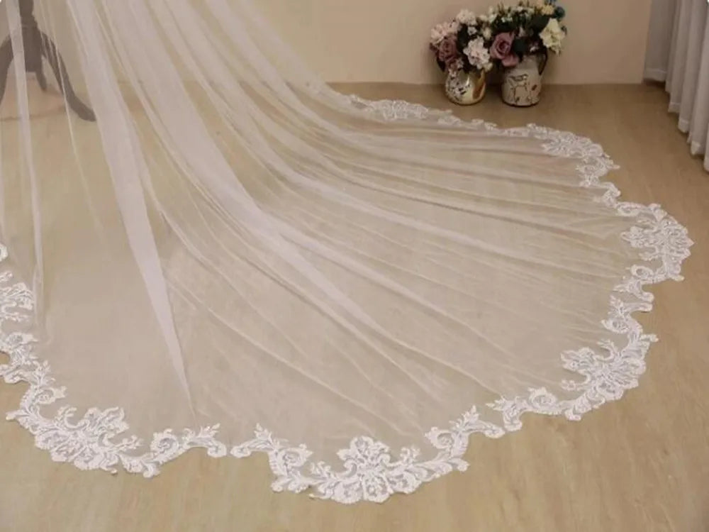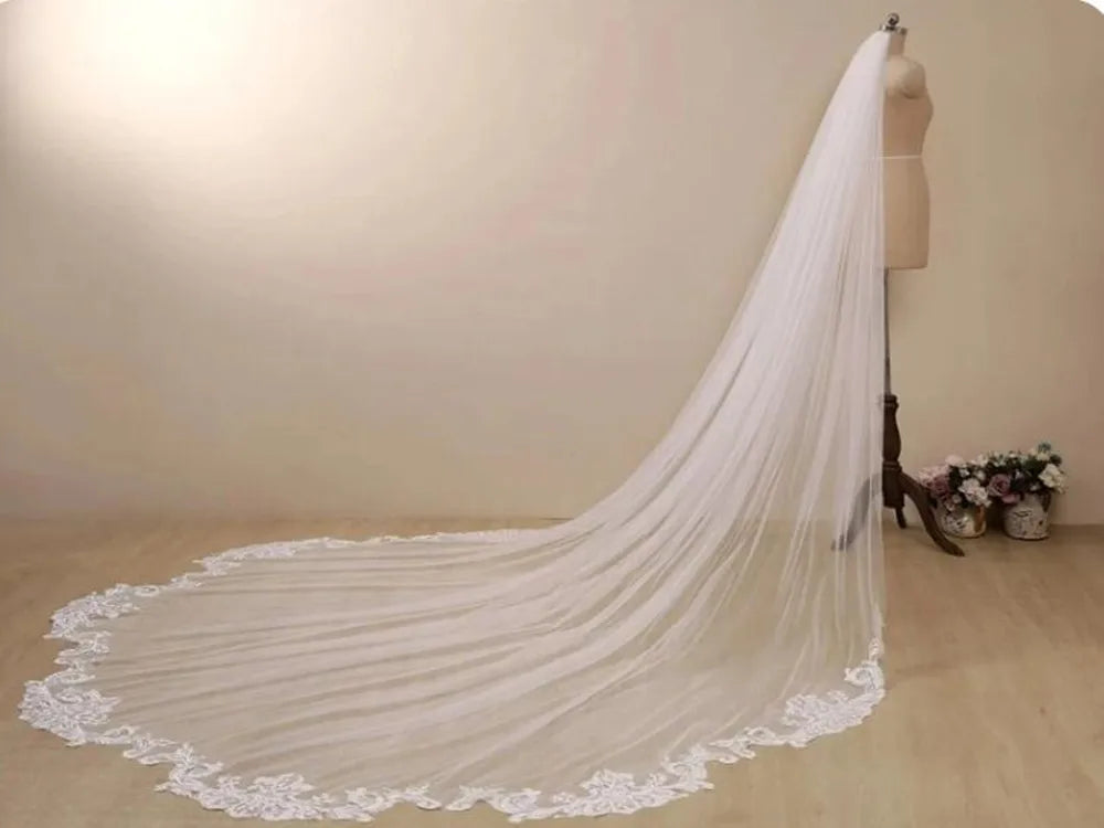 Velo de novia largo tipo catedral de encaje blanco marfil, accesorios de novia