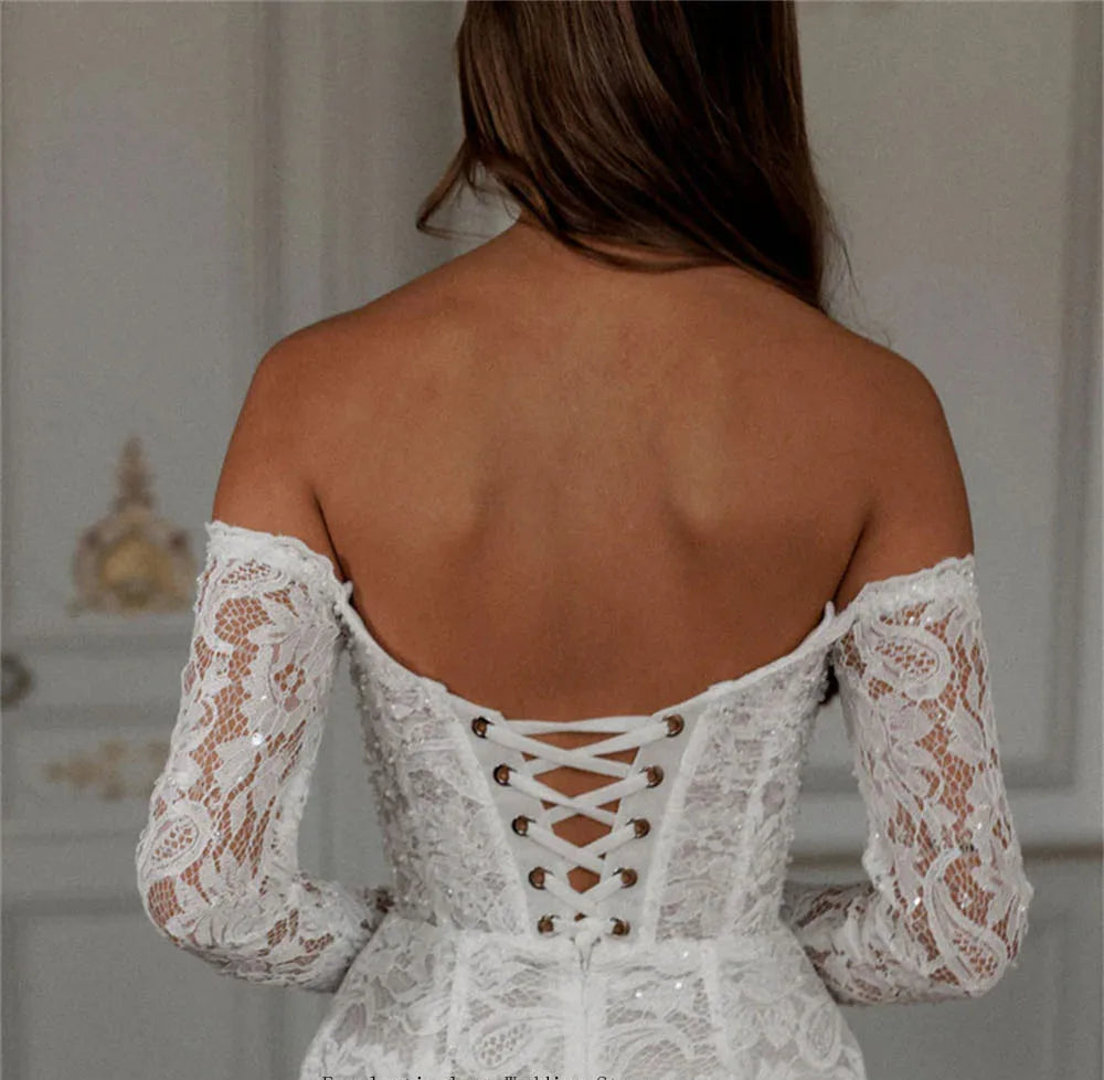 Vestido de novia mini sexy con hombros descubiertos y mangas largas de encaje completo