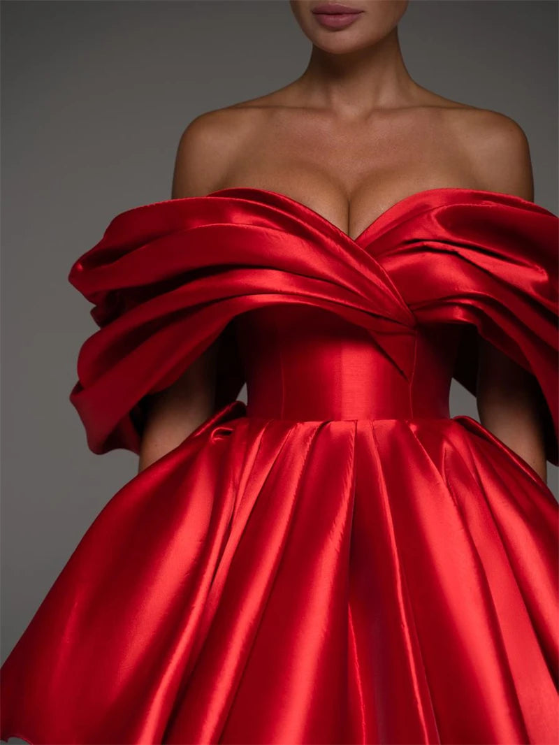 ¡Destaca en cualquier evento elegante con nuestro minivestido corto de satén para fiesta! Este moderno vestido presenta cintura ancha y falda acampanada para un look formal. La manga drapeada con volantes y hombros descubiertos le da un toque de elegancia y diversión. Perfecto para destacar entre la multitud.