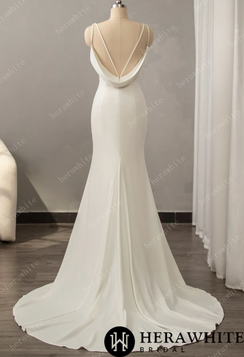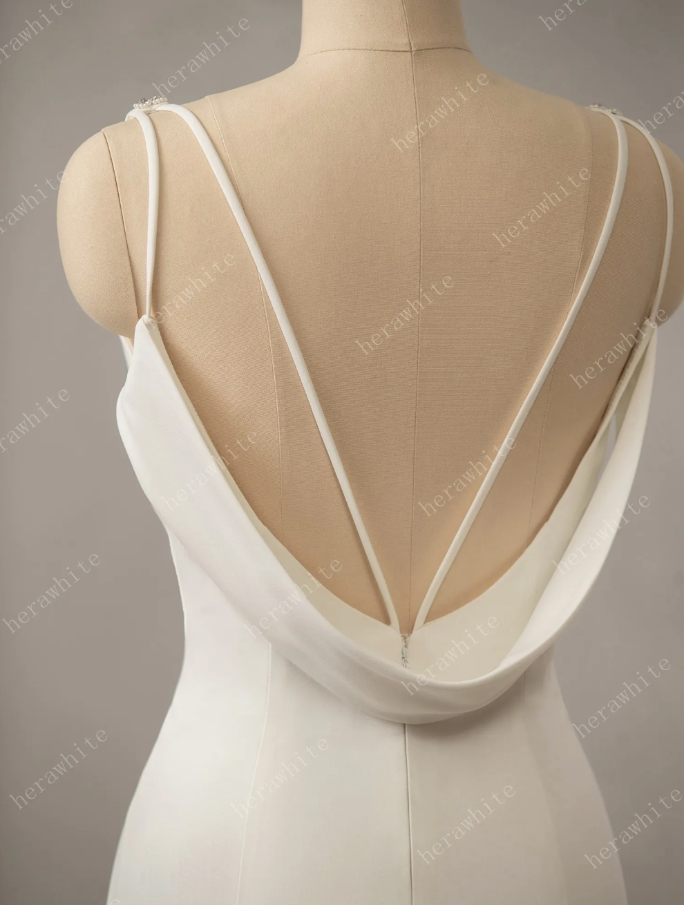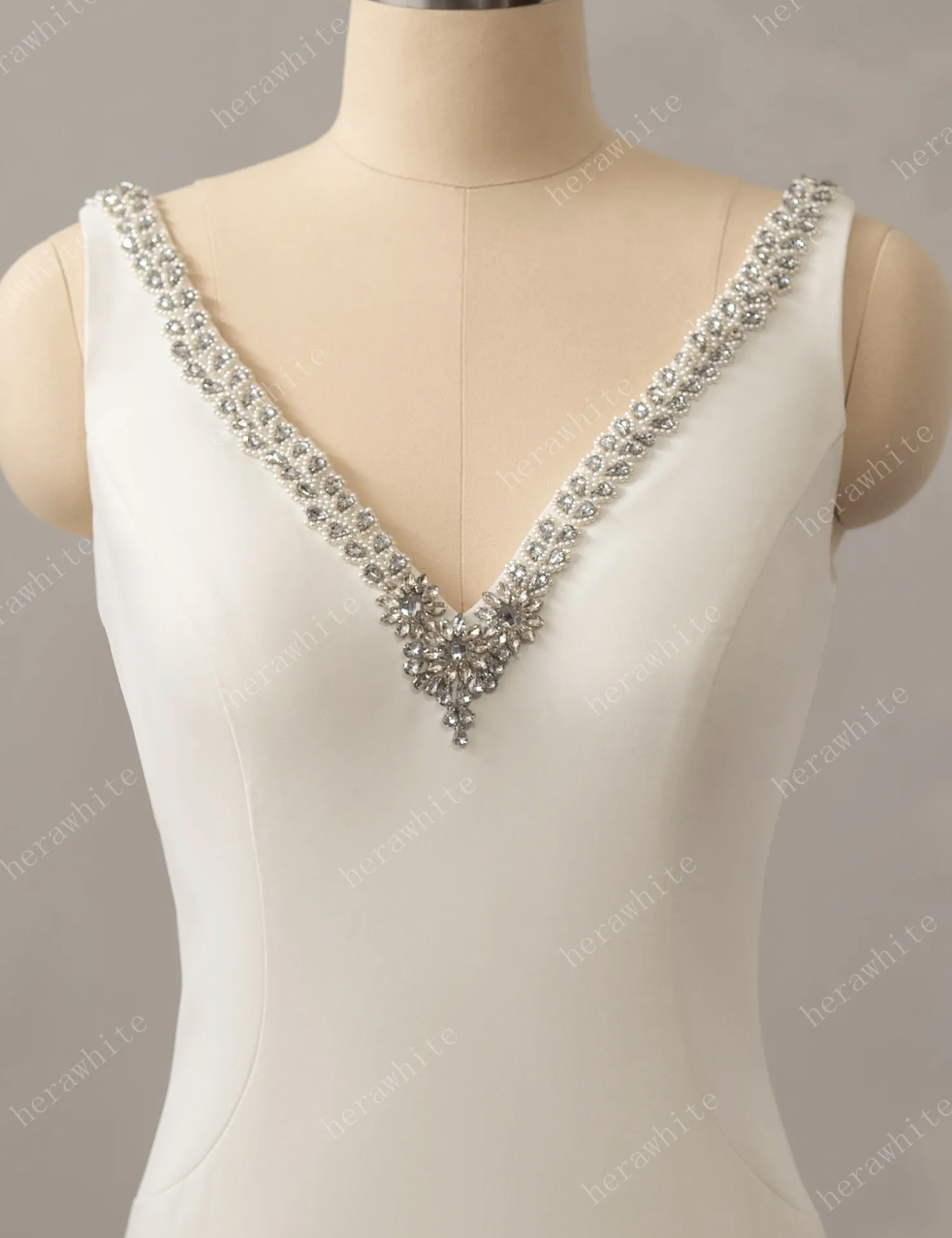 Vestido de novia de crepé con cuentas, escote en V y espalda abierta