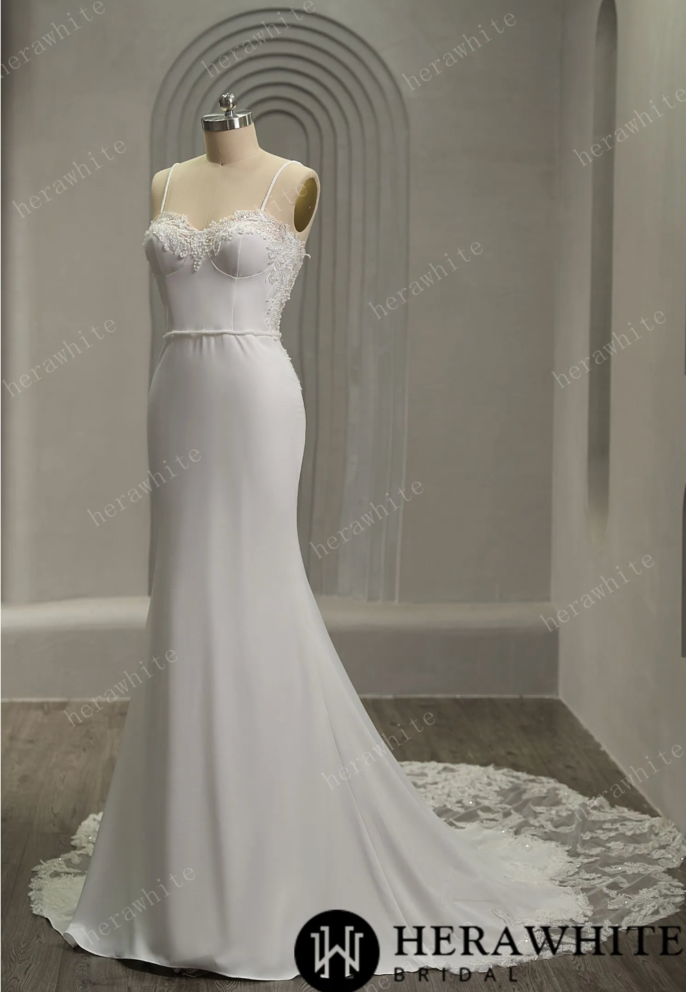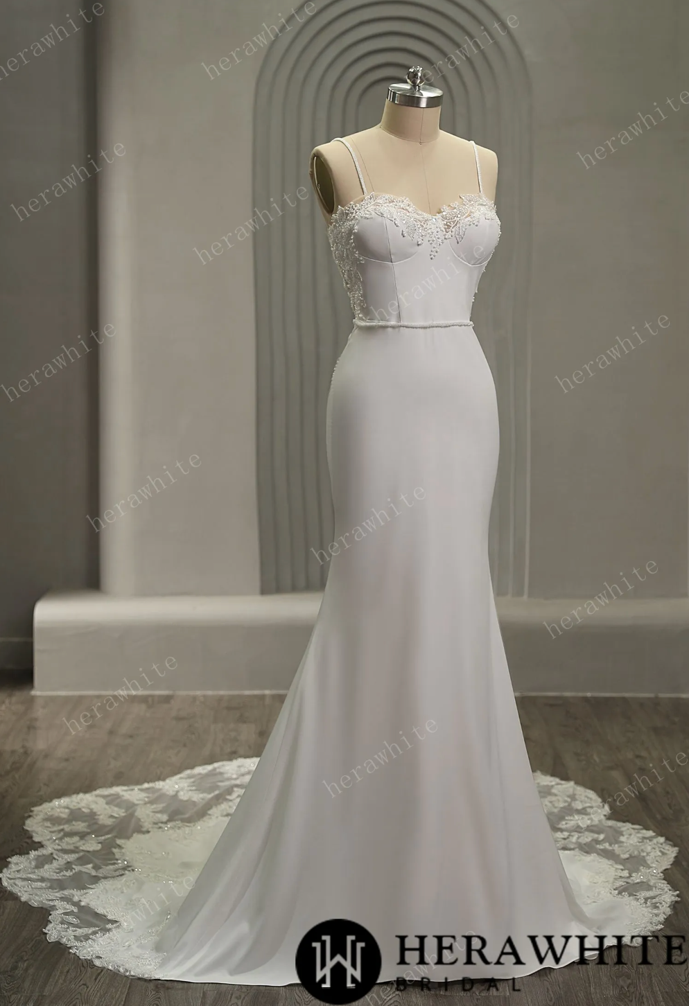 Deléitese con el exquisito diseño de este vestido, adornado con finos detalles de encaje y una silueta favorecedora. Su sobria simplicidad crea un impacto inolvidable. La dulce espalda escotada y el intrincado corpiño de encaje se fusionan con una falda acampanada, creando un impresionante efecto de bajo de encaje. Con tirantes finos que sujetan bien, la novia se sentirá segura y elegante, realzada por una larga cola adornada con intrincadas cuentas.