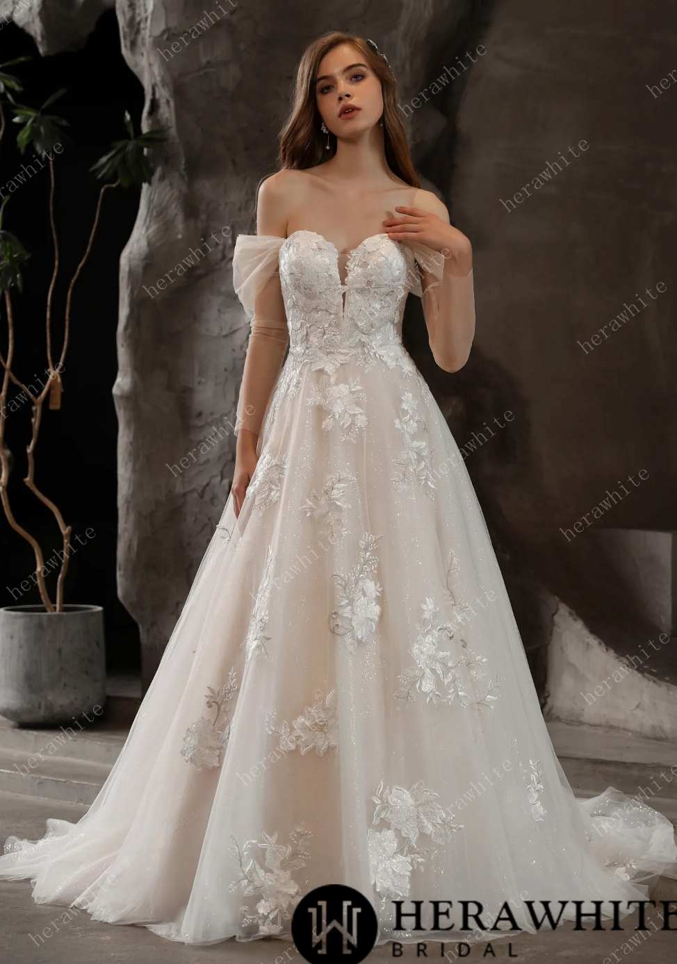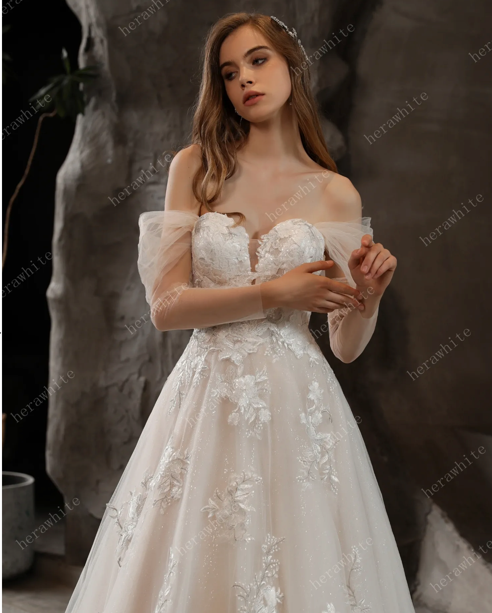 Vestido de novia romántico con hombros descubiertos y glamurosos motivos florales