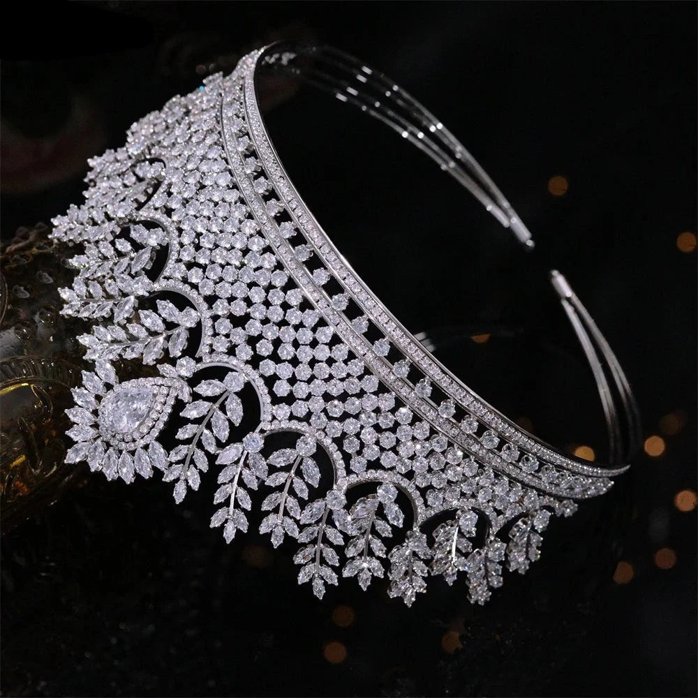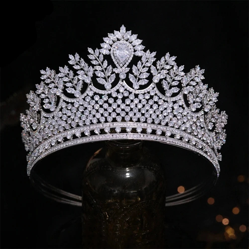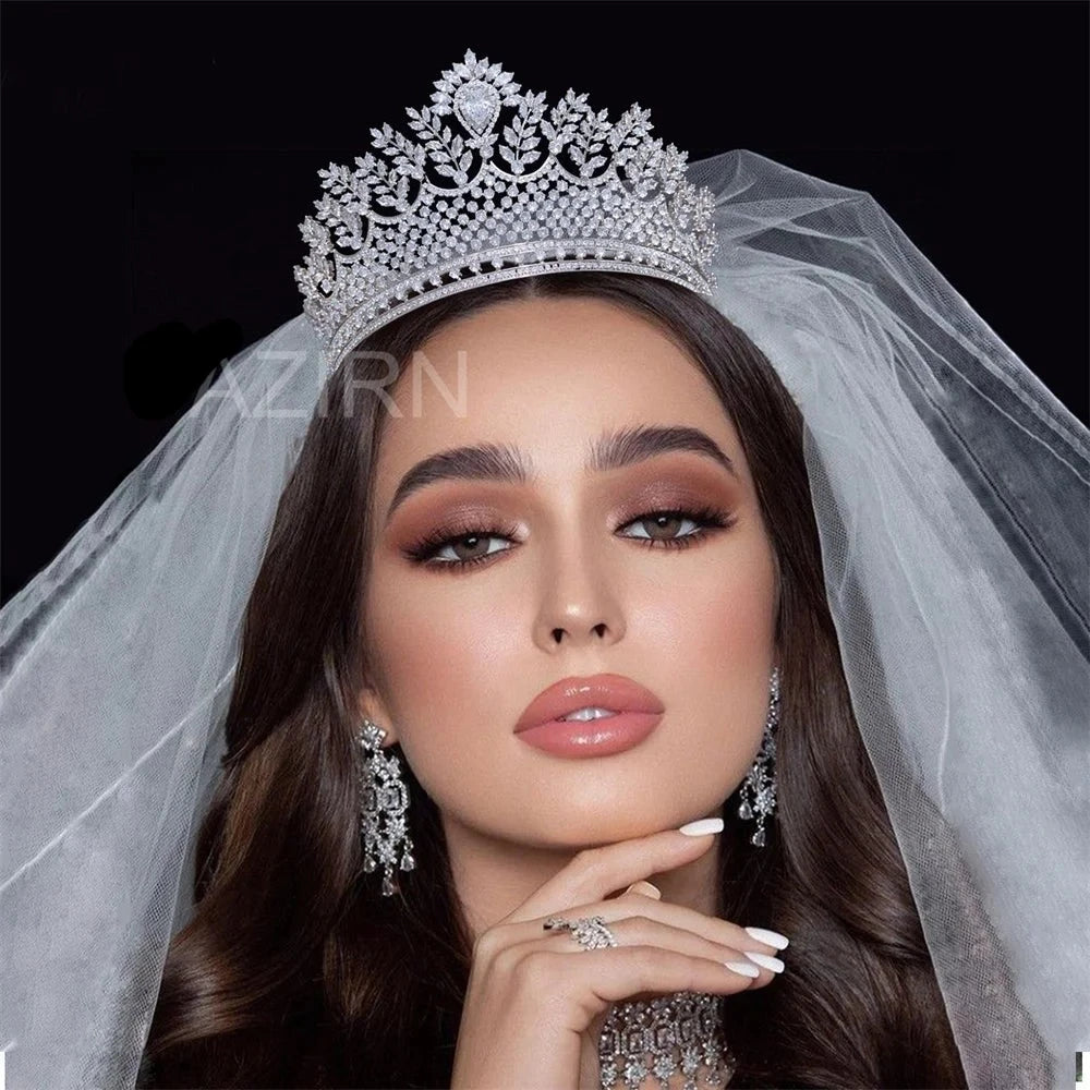 Tiara grande de novia con circonita cúbica, corona de lujo hecha a mano, accesorio para el cabello de princesa