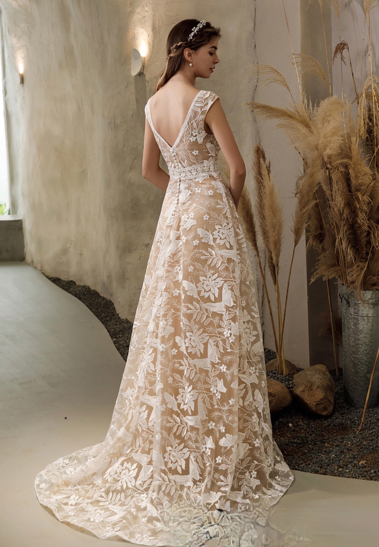 Vestido de novia de lujo con mangas cortas y encaje estilo bohemio