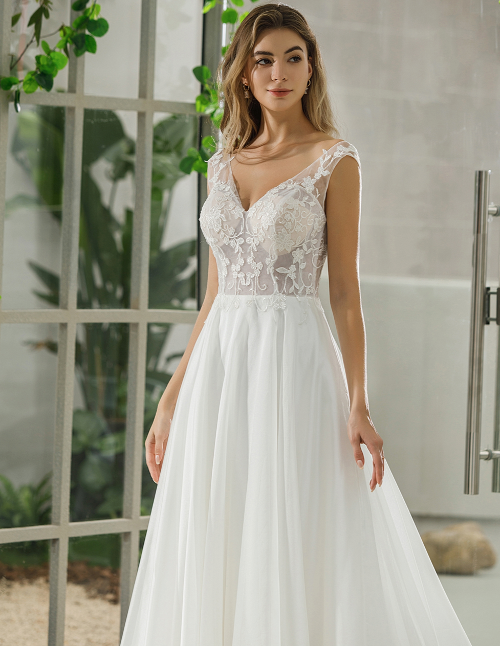 Fresco y femenino, este vestido de organza de encaje, de corte A, está bordado con delicados motivos florales, presenta escote en V y tirantes de encaje ilusión, espalda en V pronunciada y botones en la cintura con una ligera cola. Vestido en color marfil.