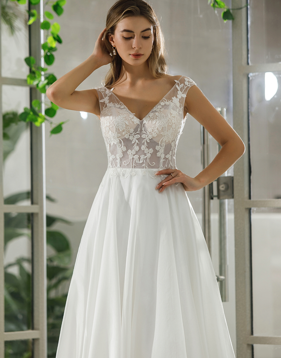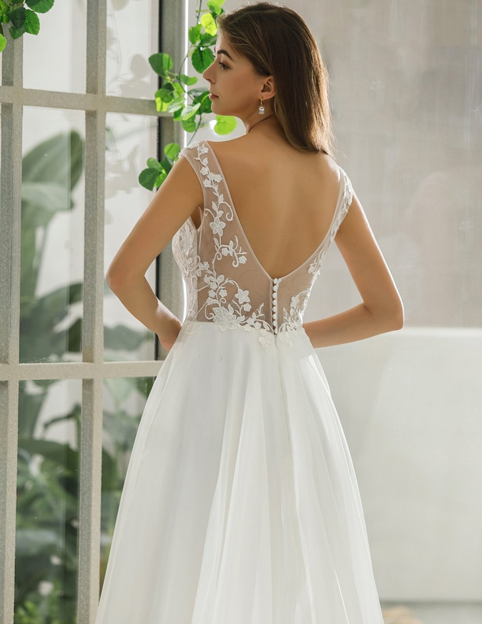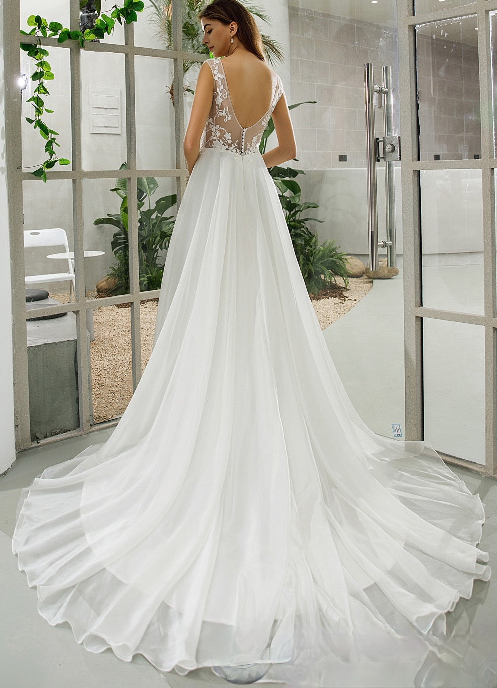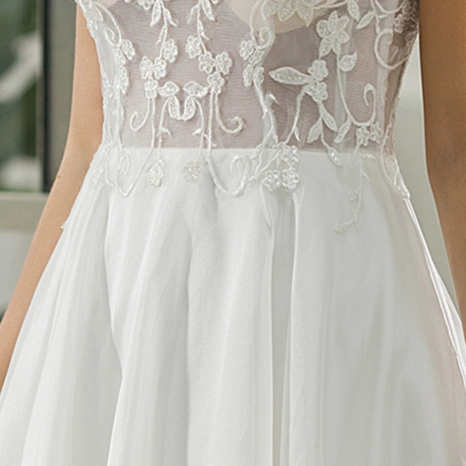 Vestido de novia de organza con encaje ilusión sin mangas