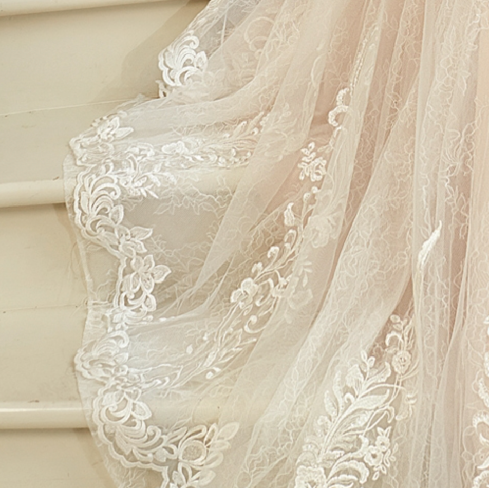 Este encantador vestido de novia realzará tu figura gracias a una capa de tul adornada con preciosos apliques de encaje que lo recorren todo el vestido y una capa de delicado encaje suave debajo. El escote barco ilusión y el canesú transparente dan paso a una preciosa espalda de cerradura adornada con botones forrados. Vestido en color marfil/rosa.