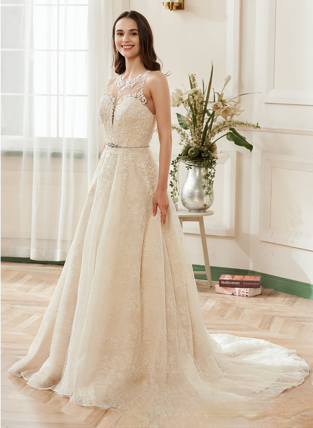 Vestido de novia clásico y elegante, de corte A y escote halter con efecto ilusión, con un corpiño con apliques de encaje floral y una suave capa de encaje por debajo, que se combina con una bonita espalda ilusión adornada con botones. El cinturón de cristales en la cintura da paso a una falda amplia de tul con encaje y una cola capilla que completa el look.