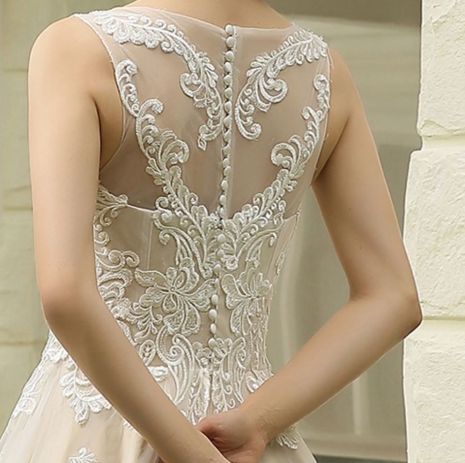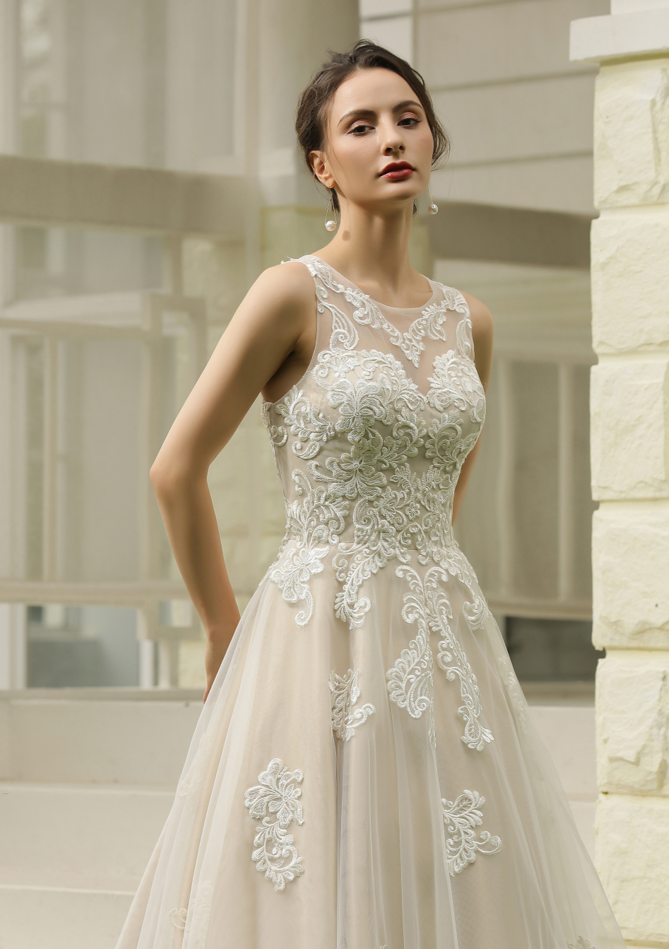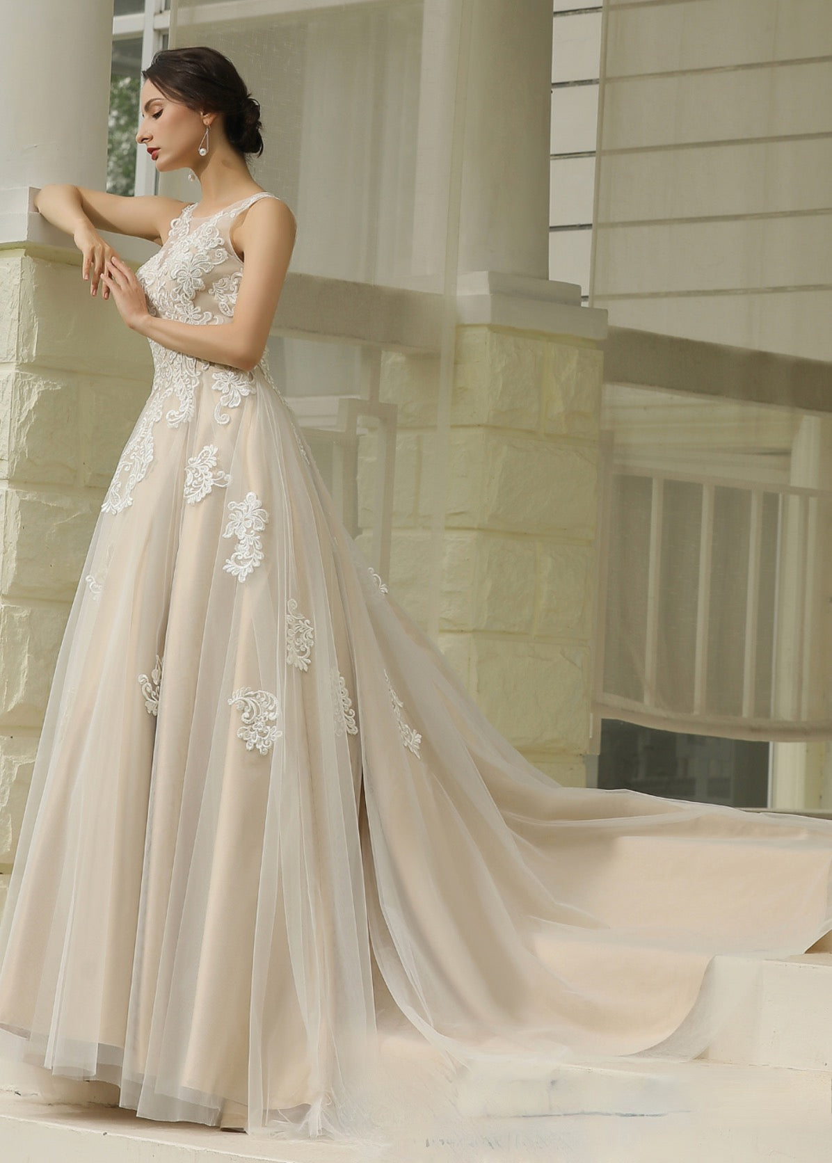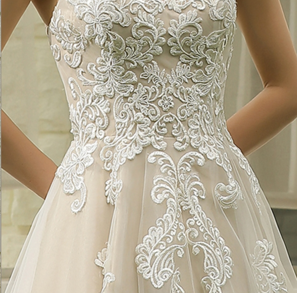 Preciosos motivos de encaje sobre tul con un halter ilusión sobre un escote corazón y una espalda halter ilusión que aporta un toque de brillo con la espalda abotonada y la cola amplia, como se muestra. Vestido en color marfil/rosa.