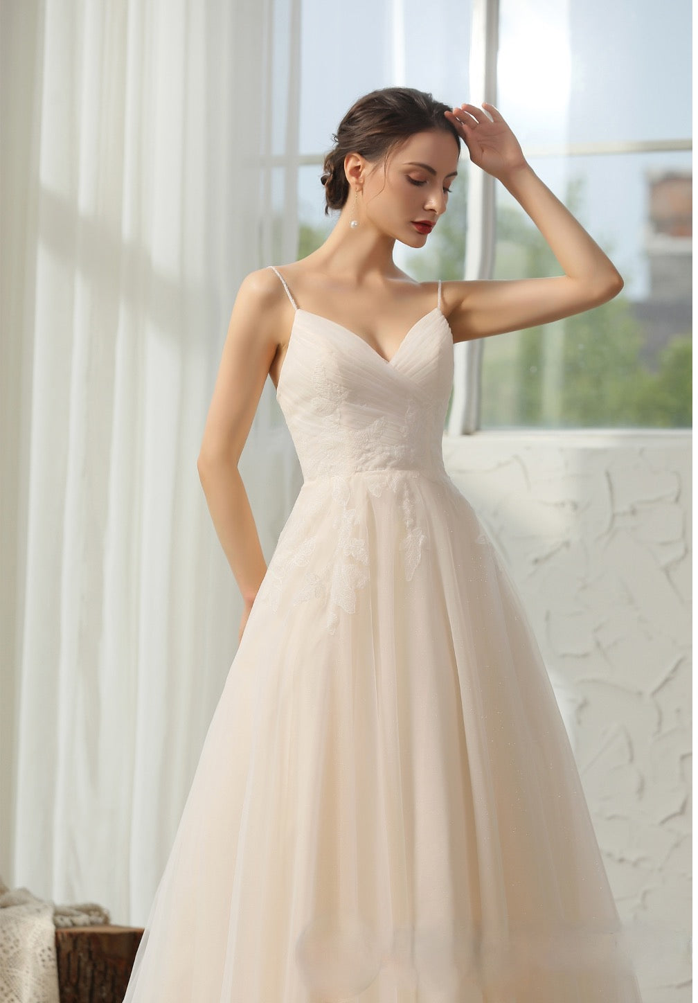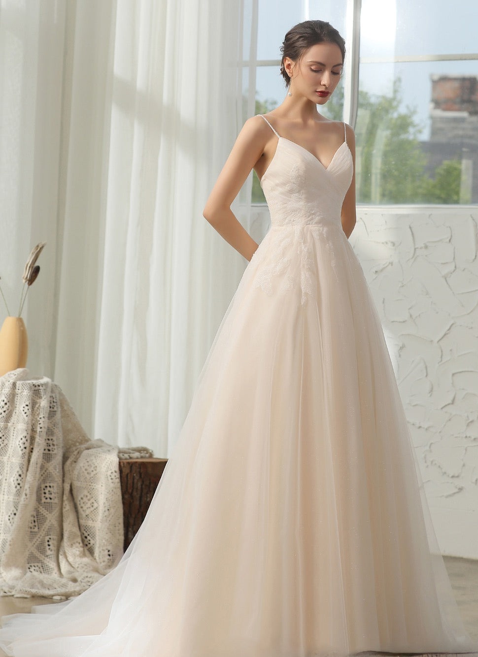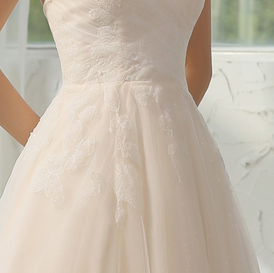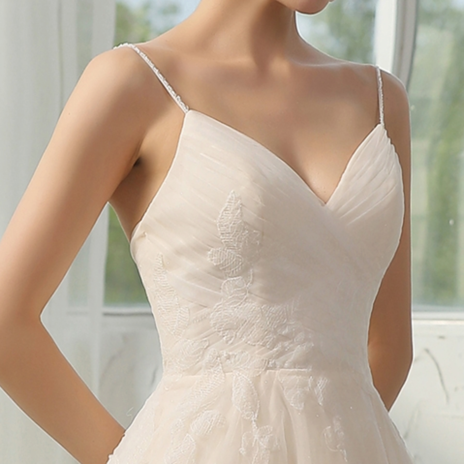 Vestido de novia sencillo y elegante con escote en V y tirantes finos adornados con cuentas. Presenta un delicado encaje aplicado sobre un corpiño plisado de gran calidad y una romántica falda abullonada en forma de A con cola de corte. Vestido en color marfil/champán.