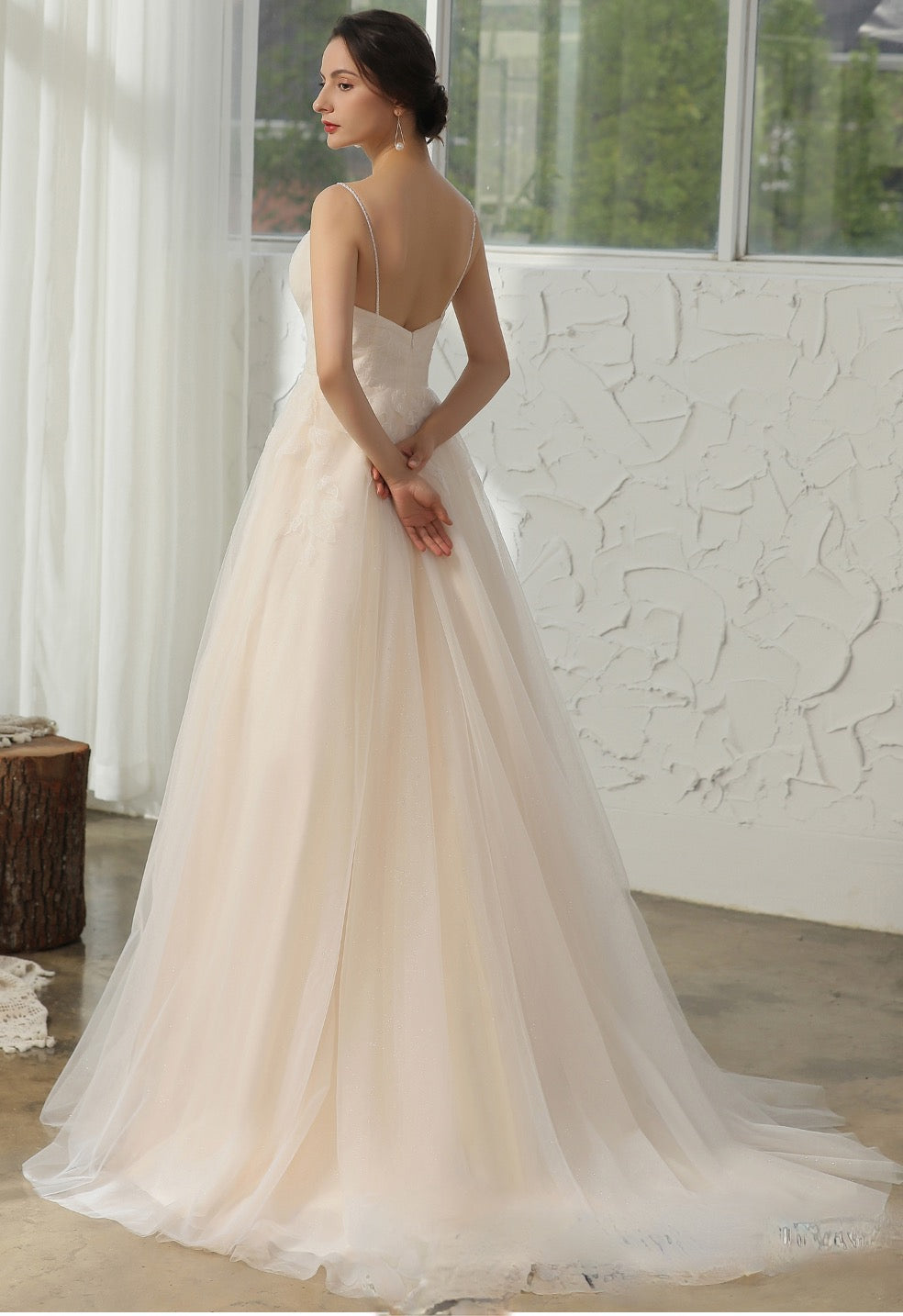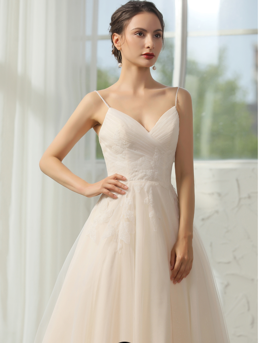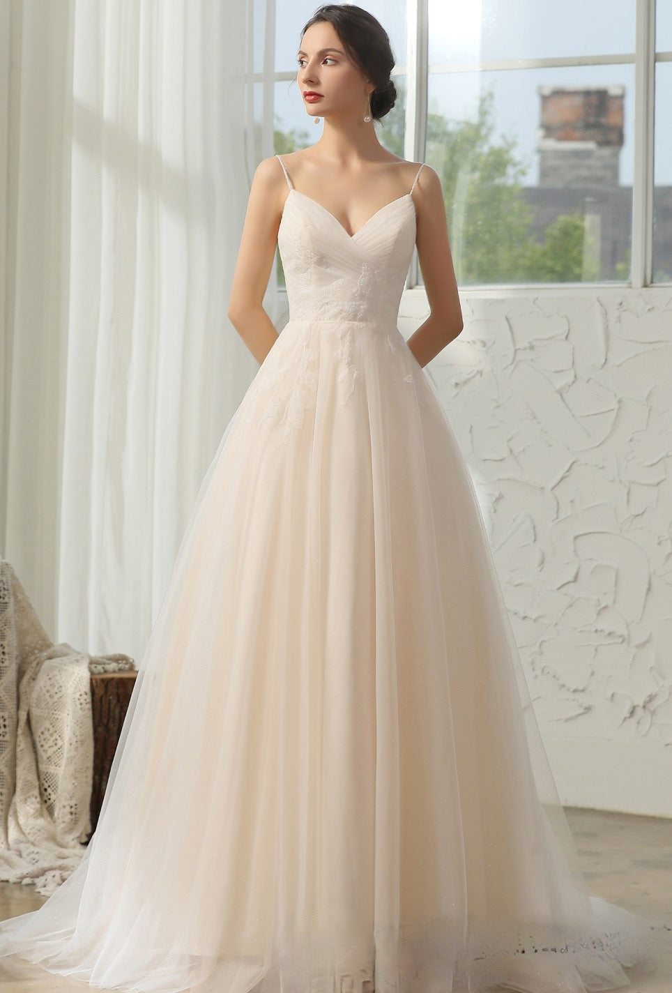 Vestido de novia sencillo y elegante con escote en V y tirantes finos adornados con cuentas. Presenta un delicado encaje aplicado sobre un corpiño plisado de gran calidad y una romántica falda abullonada en forma de A con cola de corte. Vestido en color marfil/champán.