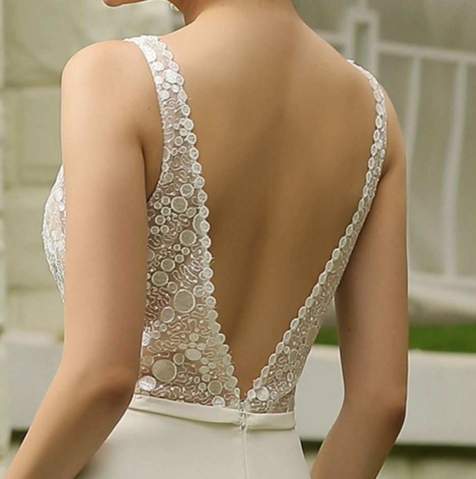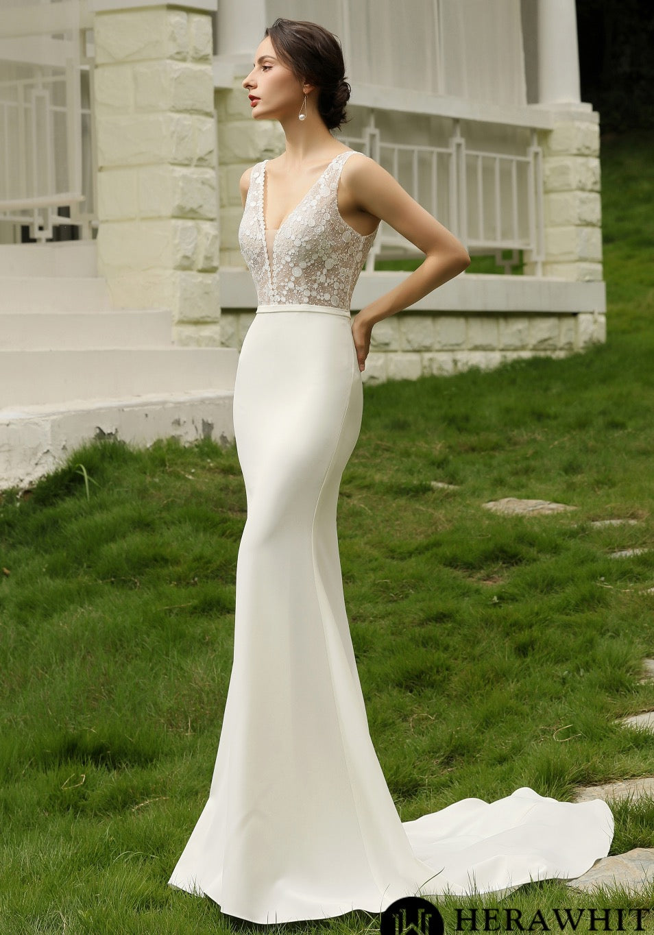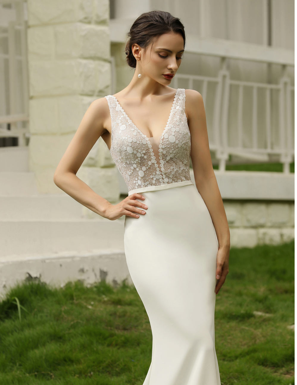 Este vestido de novia clásico y chic es absolutamente glamuroso. Su corpiño semitransparente, confeccionado con una hermosa aplicación de encaje, con escote en V y espalda abierta, combina a la perfección con una sencilla falda sirena de crepé y una cola de corte, realza el rostro y añade un toque de sensualidad.