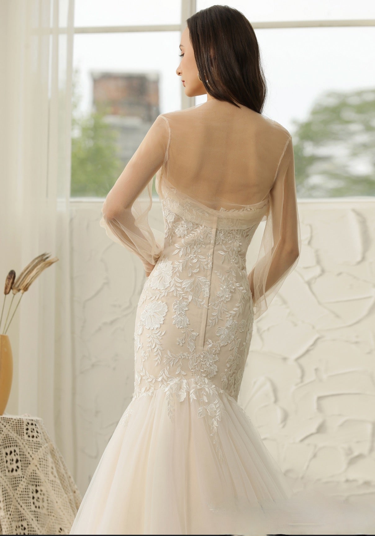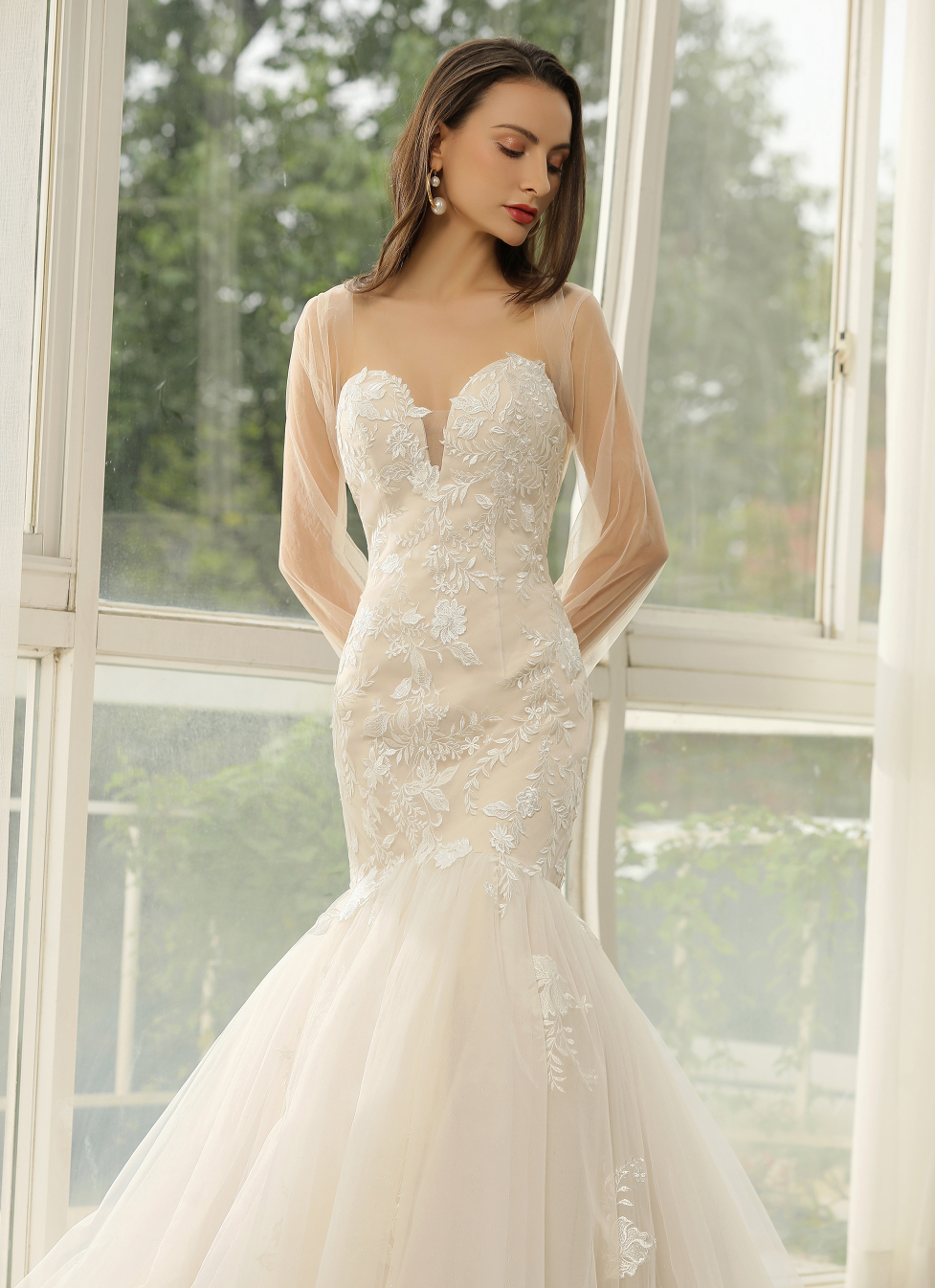 Vestido de novia de sirena con encaje de tul y escote corazón