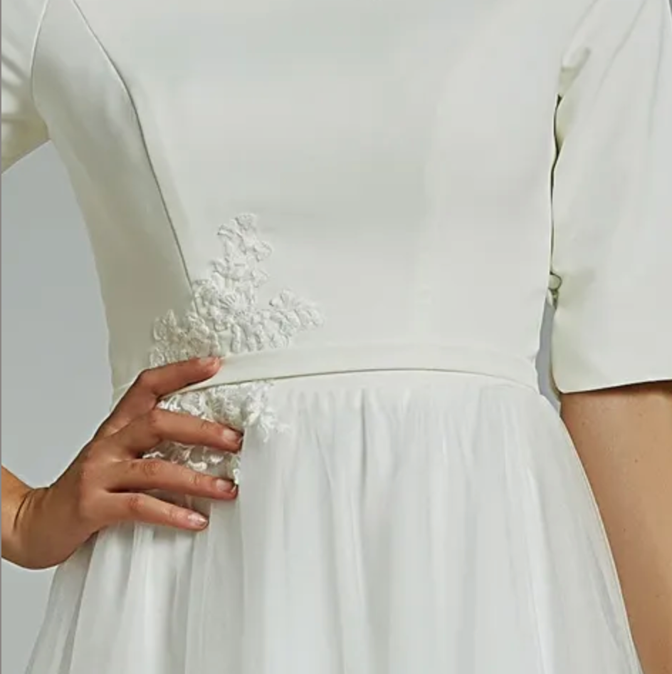 El sencillo vestido de novia de crepé color marfil con corpiño y exquisito encaje floral es todo menos común. Su escote barco, medias mangas y una discreta espalda amplia le dan un toque de distinción. La sencilla falda de cola en A cae desde la elegante cinturilla para definir la figura. Se muestra en color marfil.