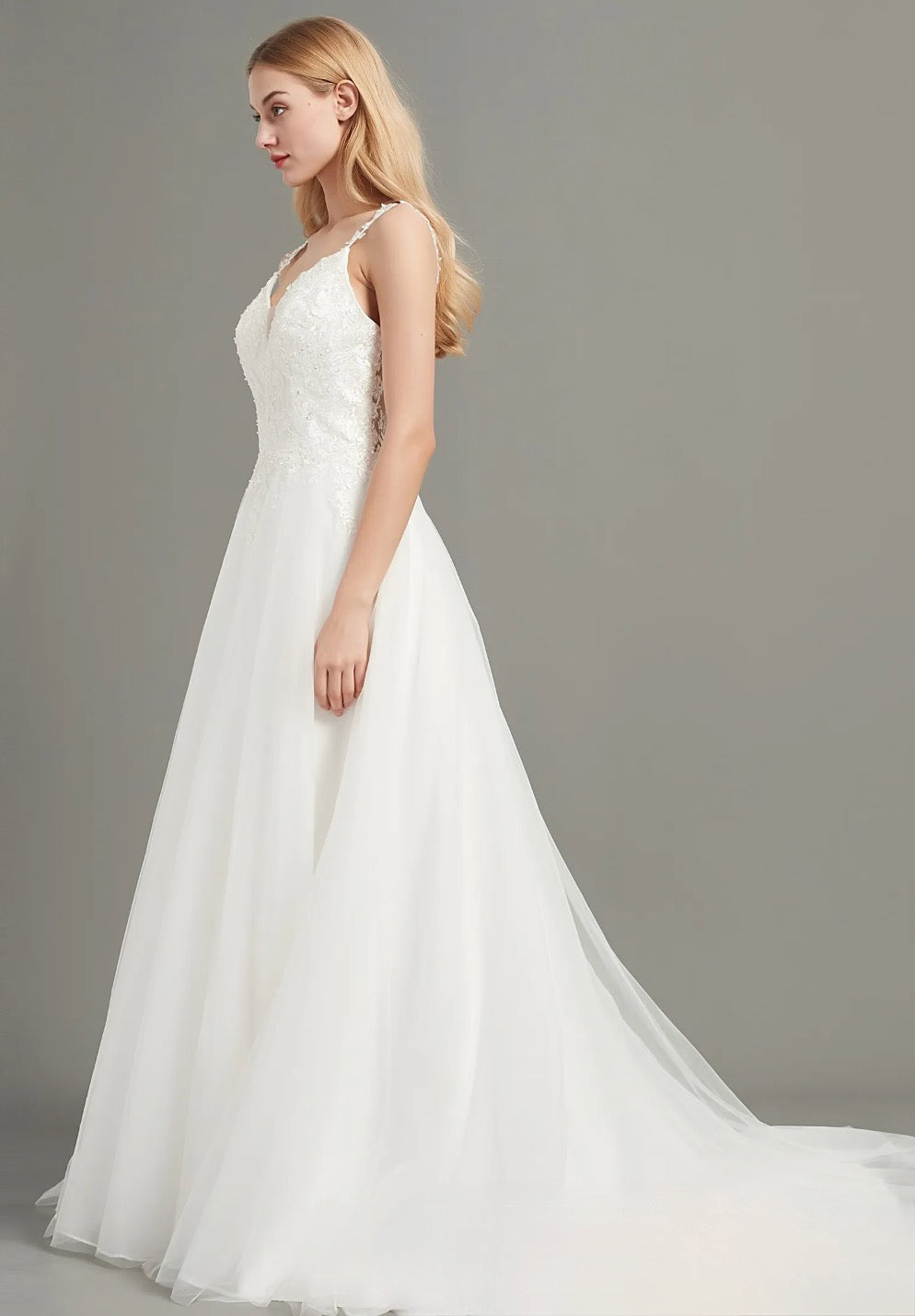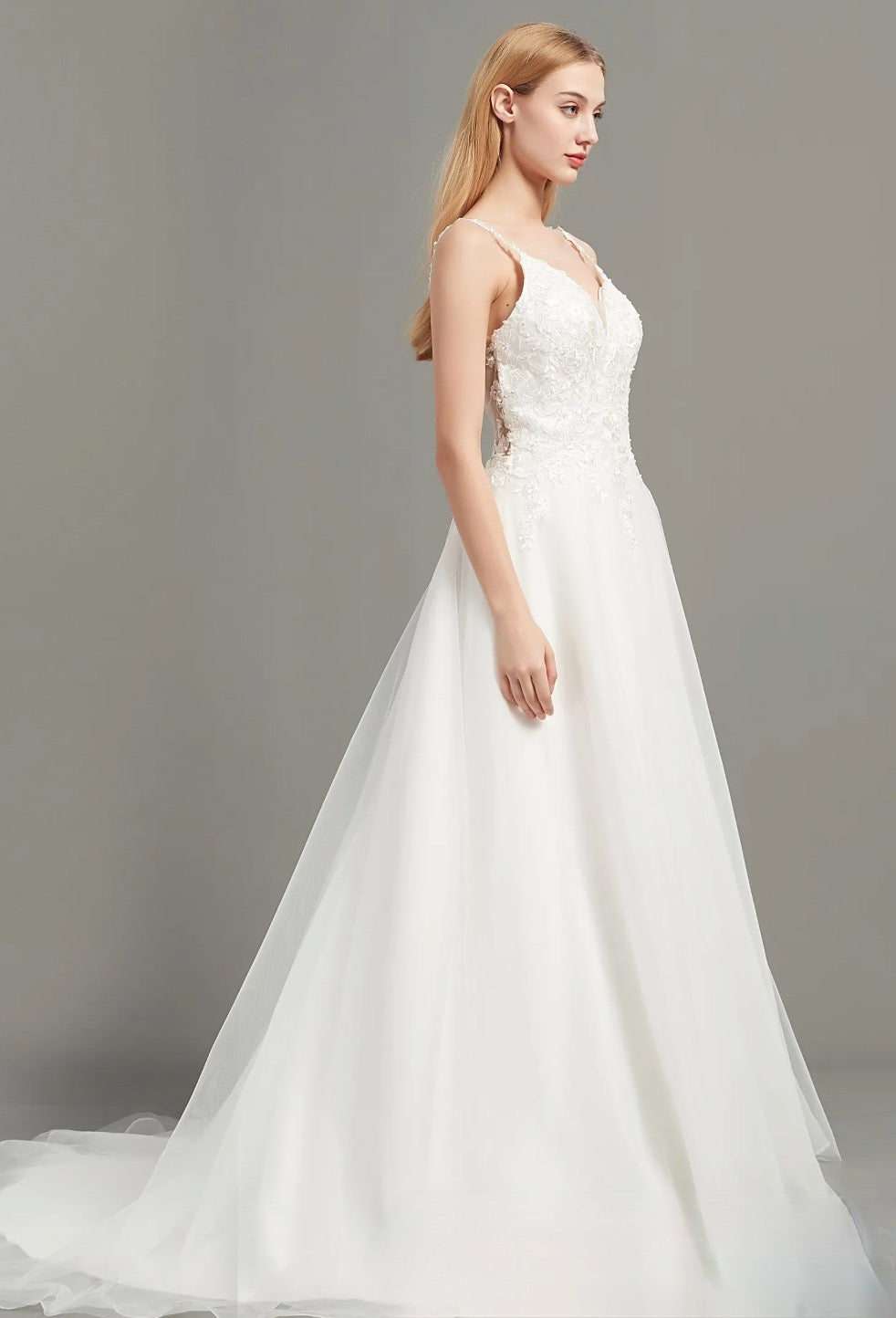 Este vestido de novia ligero y etéreo presenta tirantes con apliques y un corpiño de encaje con escote en V y detalles de cuentas de cristal. Una falda fluida de tul en forma de A y una espalda en V pronunciada completan el look. Vestido en color marfil.