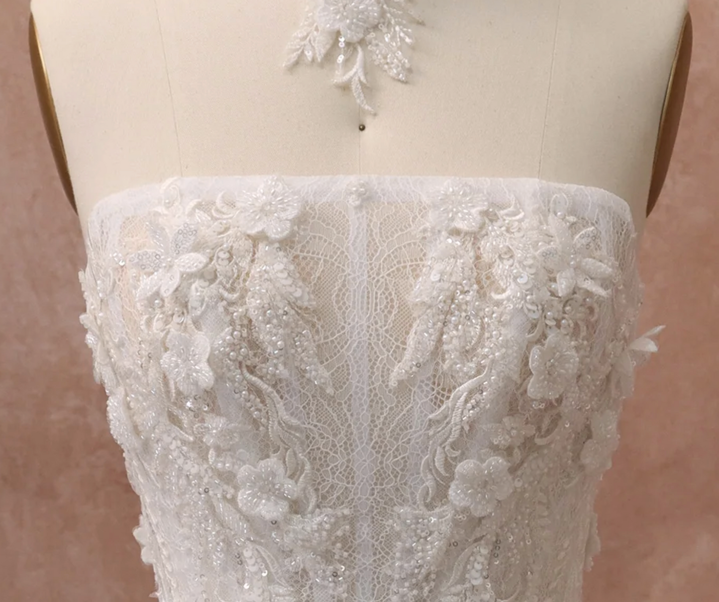 Si esta es tu primera experiencia comprando un vestido de novia, ten en cuenta que no son como los vestidos normales. Pueden ser rígidos debido a las múltiples capas, los adornos cosidos a mano que requieren una tela rígida para coserlos, y las enaguas de tul o el encaje cosidos sobre la tela del vestido también pueden ser rígidos. Los vestidos de novia están cosidos para resistir la presión y mantener todo en su lugar durante el evento. Las copas del sujetador están hechas de poliéster firme para que no se note nada a través del vestido.