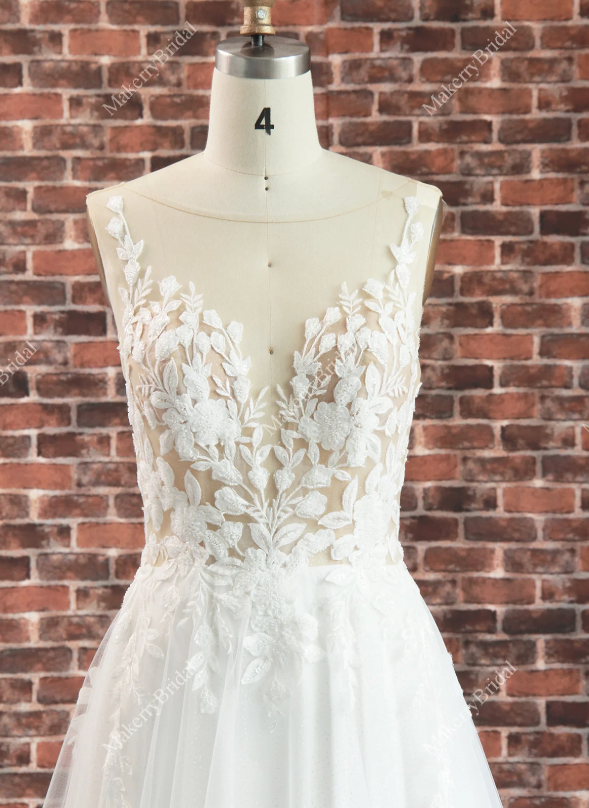 Vive la boda perfecta en el jardín con nuestro vestido de novia de corte A con encaje de tul. Adornado con un escote redondo ilusión, delicados detalles de encaje en el corpiño que caen en cascada por la falda con un dobladillo de tul cortado, este vestido rebosa elegancia. Una ligera cola, espalda en V y botones de cristal añaden un toque de lujo, mientras que una cremallera en la cintura completa el look.