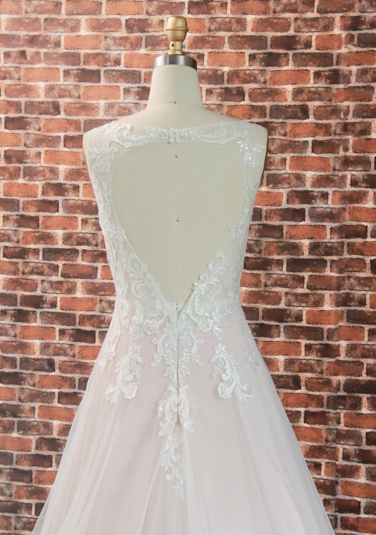 Disfrute del máximo lujo con este exquisito vestido de corte A. Un auténtico cuento de hadas moderno, la intrincada falda de encaje y tul se realza con el delicado y atractivo detalle en forma de corazón en la espalda. Experimente el encanto y la sofisticación de este vestido ultrarromántico.