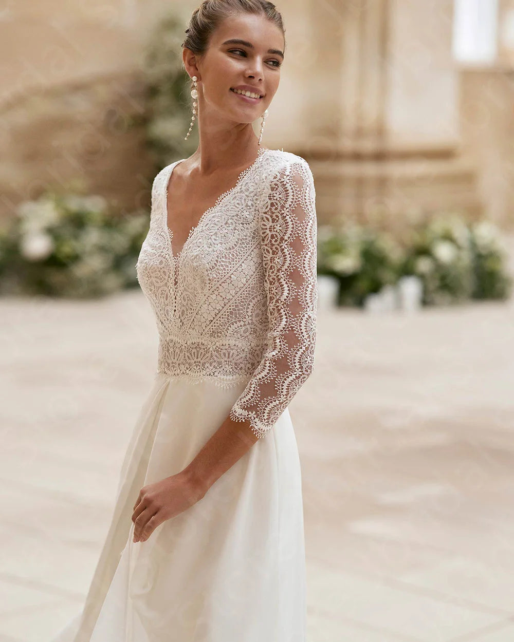 Wedding Jumpsuit Lace Bridal Pants Suit, This elegant wedding dress jumpsuit combines sophistication and comfort with a delicate lace bodice featuring a V neckline and three-quarter sleeves. The lace waist sash accentuates your figure, while the deep V illusion back with buttons adds a refined touch. Wide-leg pants with a subtle back train complete this modern bridal look, perfect for celebrating your special day in style and ease.