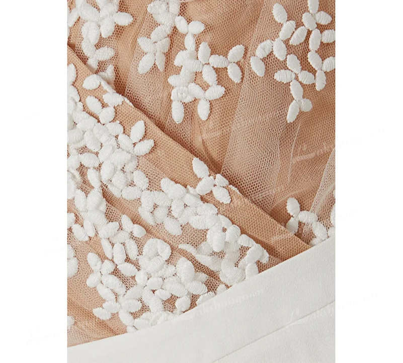 Siéntete segura y cómoda en tu gran día con nuestro mono de encaje bohemio. Su impresionante diseño de encaje presenta mangas largas y una silueta acampanada, ideal para una boda boho chic. El forro color piel del corpiño le da un toque de elegancia, convirtiéndote en el centro de atención. Disfruta de tu día especial con estilo y comodidad.
