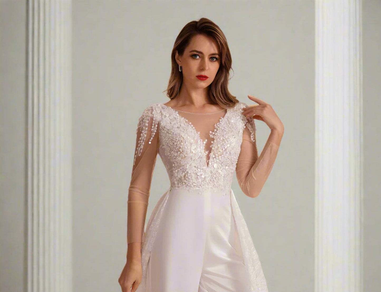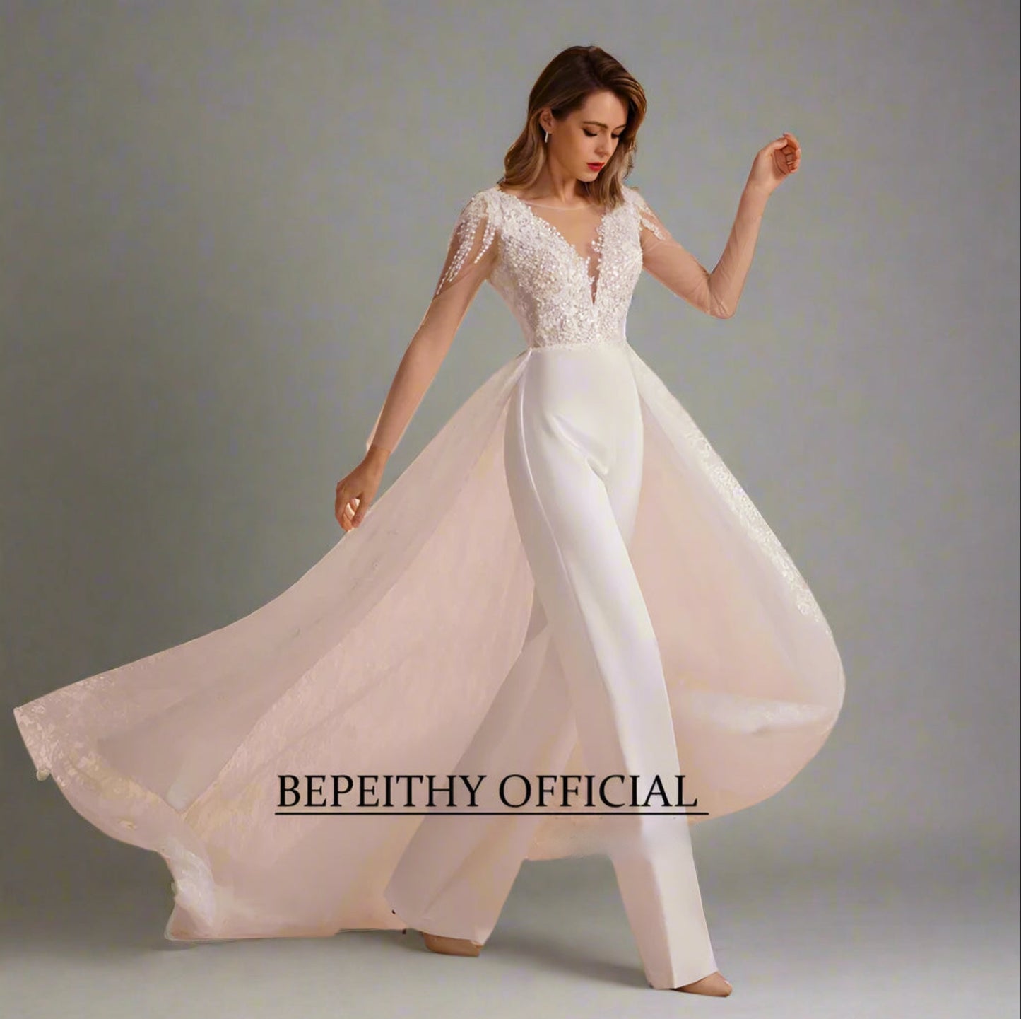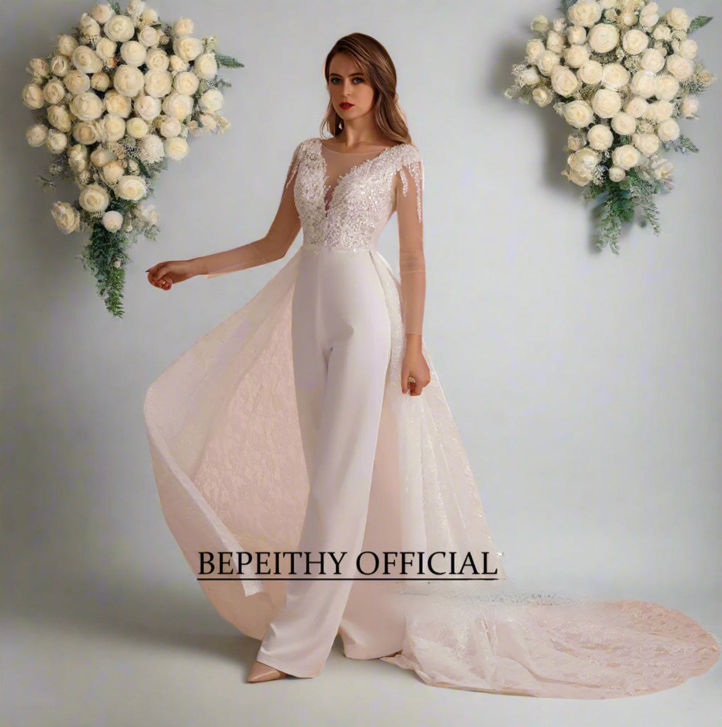 ¡Déjate seducir por el encanto seductor de nuestro impecable mono de novia de encaje para mujer! Esta impresionante pieza presenta un delicado corpiño de encaje con un favorecedor escote en V, un escote redondo de red, mangas largas y ajustadas de red y alegres borlas en los hombros. El escote redondo de red y las elegantes mangas largas añaden un toque de ilusión, mientras que la falda de encaje desmontable transforma fácilmente este mono de la ceremonia a la recepción, manteniéndote lista para la fiesta toda la noche. ¡Destaca en tu evento especial con este imprescindible accesorio de moda!