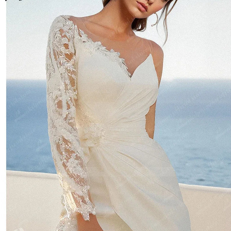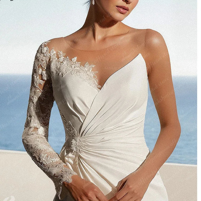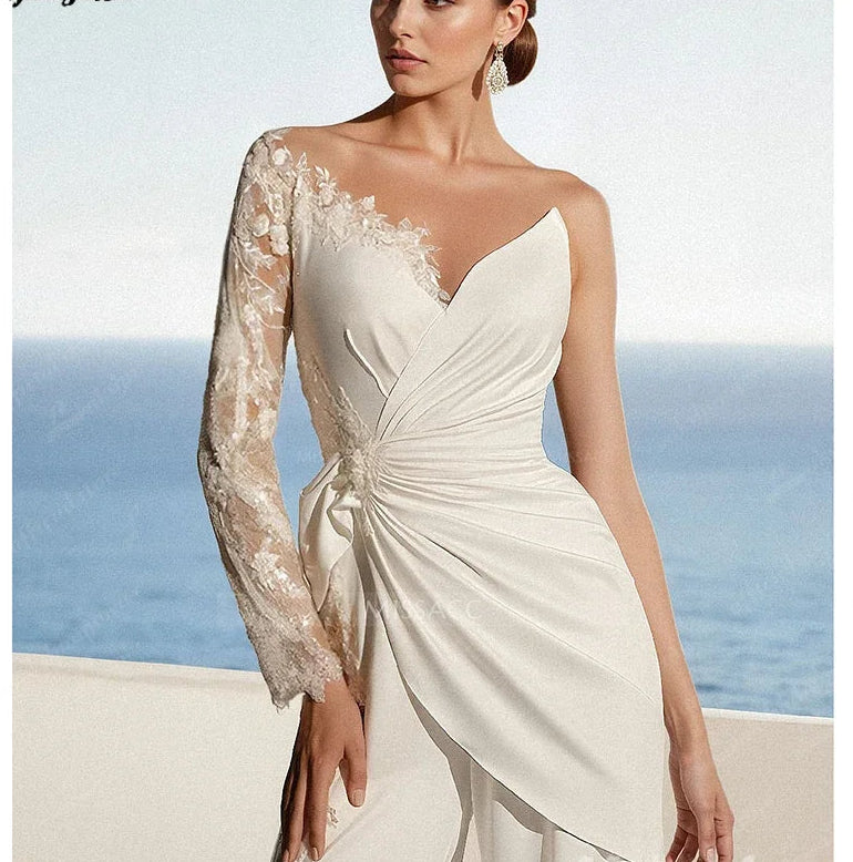 Wedding Jumpsuit With Lace Sleeve Civil Boho Bridal Gown Pantsuit, walk down the aisle in unexpected style with this boho bridal jumpsuit that breaks all the rules. Featuring an elegant one-shoulder lace sleeve, a daring backless design with intricate lace detailing, and a matching side leg lace insert, this piece celebrates modern romance. The draped front and delicate net o-neckline create effortless sophistication, while the built-in bra ensures comfort and confidence. Perfect for the bride who dares to be different—civil ceremonies, elopements, or anyone ready to make a statement in their own way.