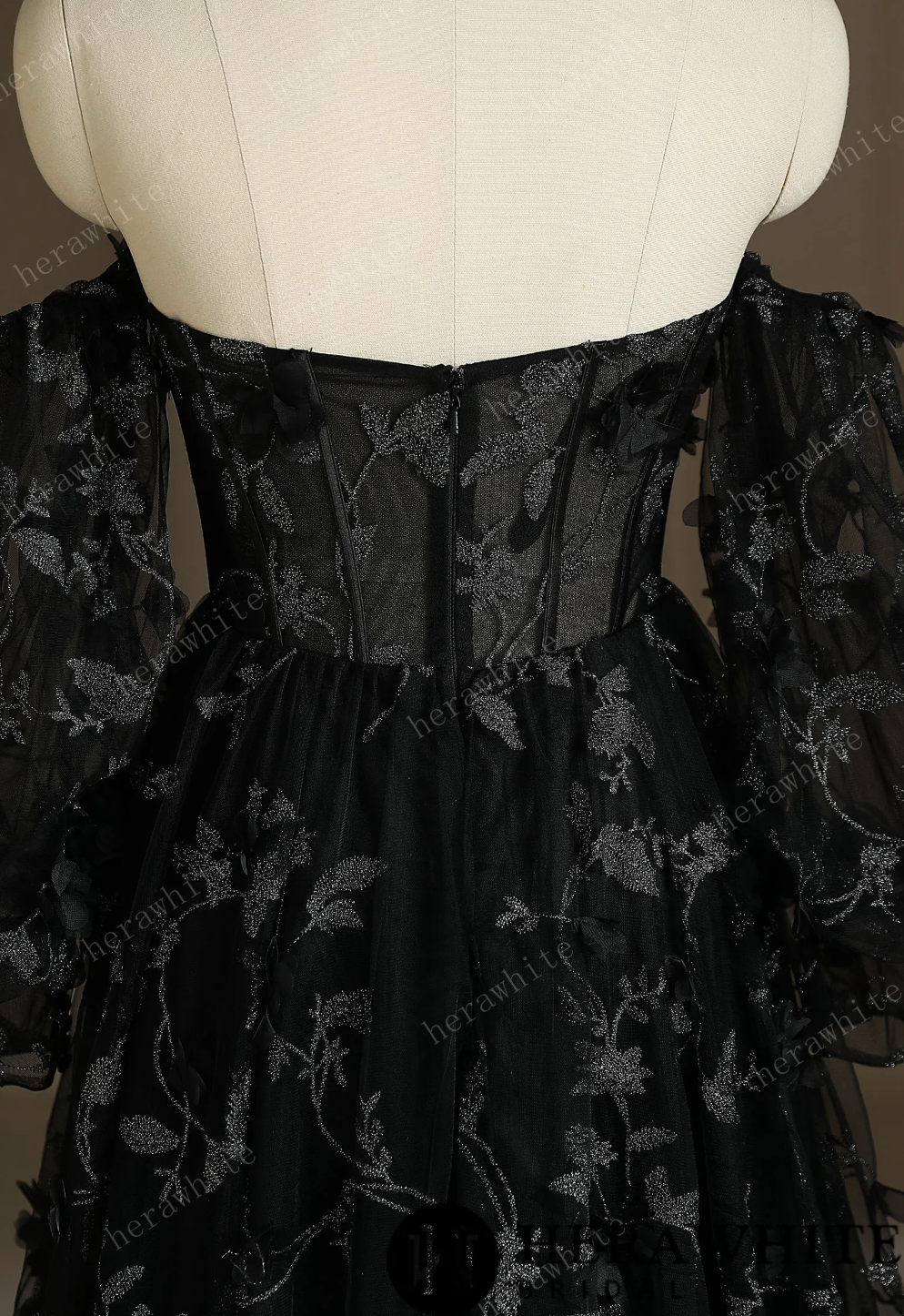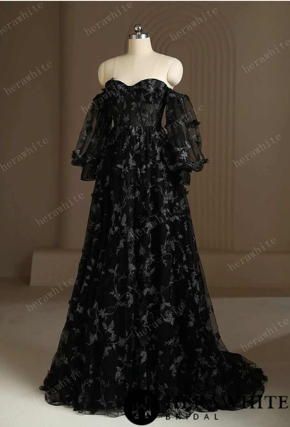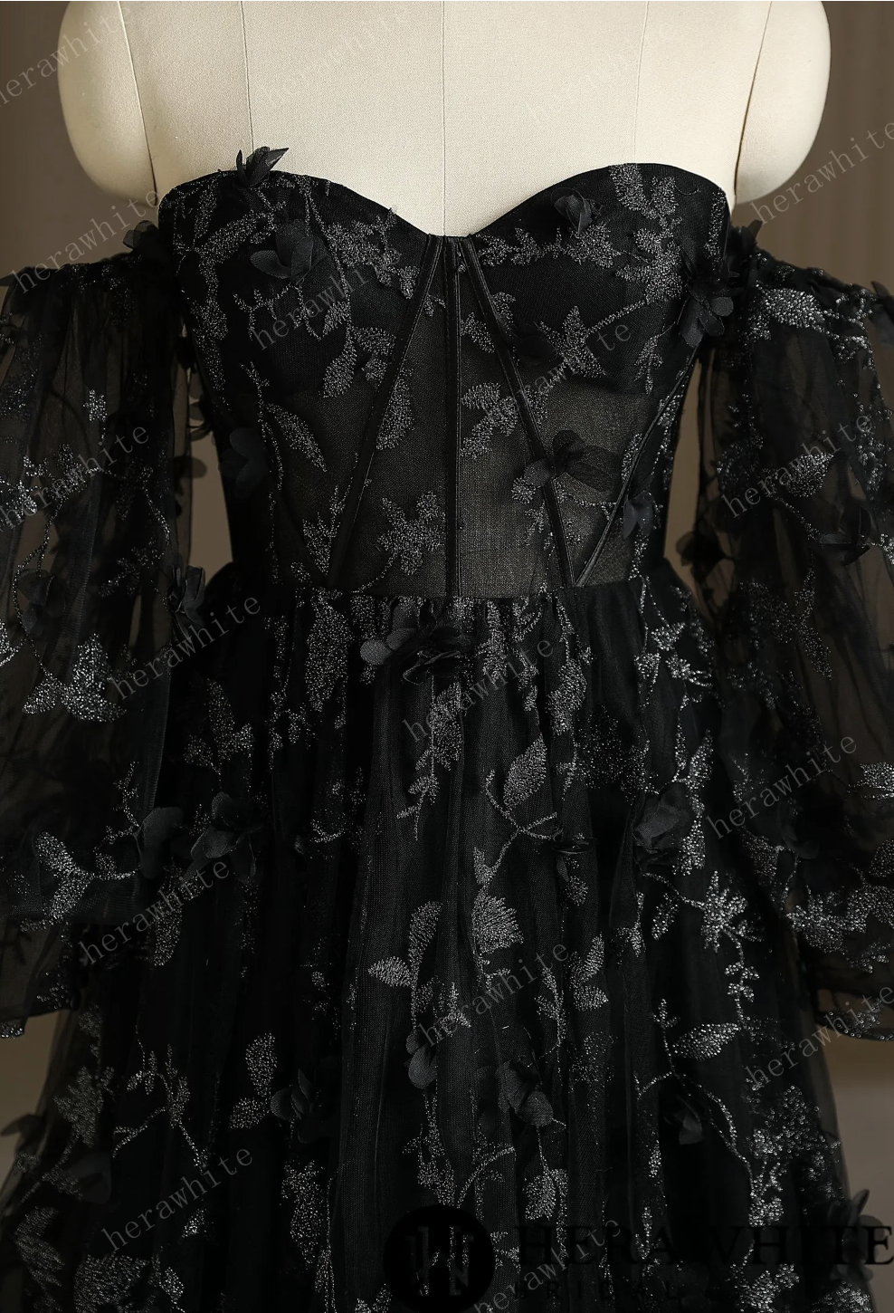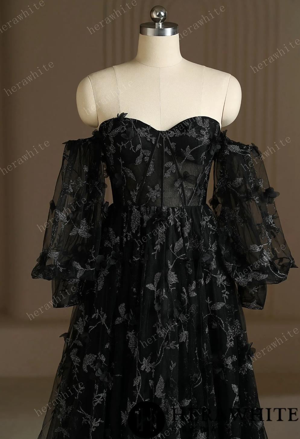 3D Lace Black Embroidery Wedding Dress, This stunning black wedding dress boasts an exquisite 3D lace appliqué embroidery and a detachable sleeve design. The high-quality lace edges add a touch of charm and elegance to the overall look, while the sleeves can be easily removed as desired, giving you the flexibility to customize your look for any occasion during your special day.