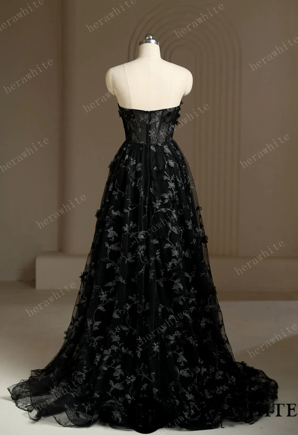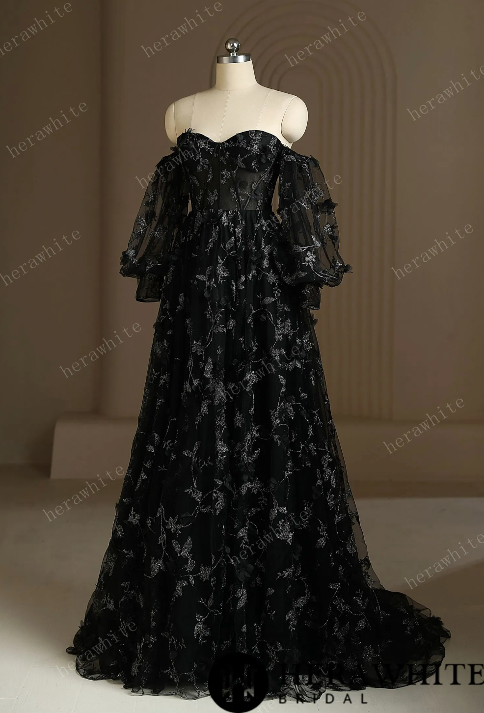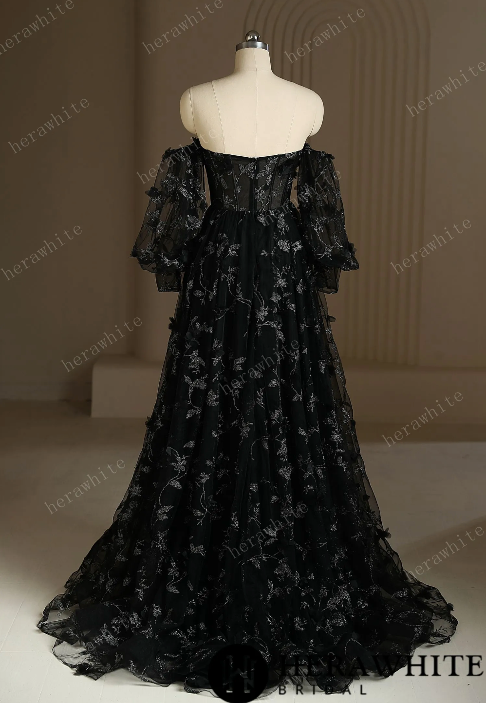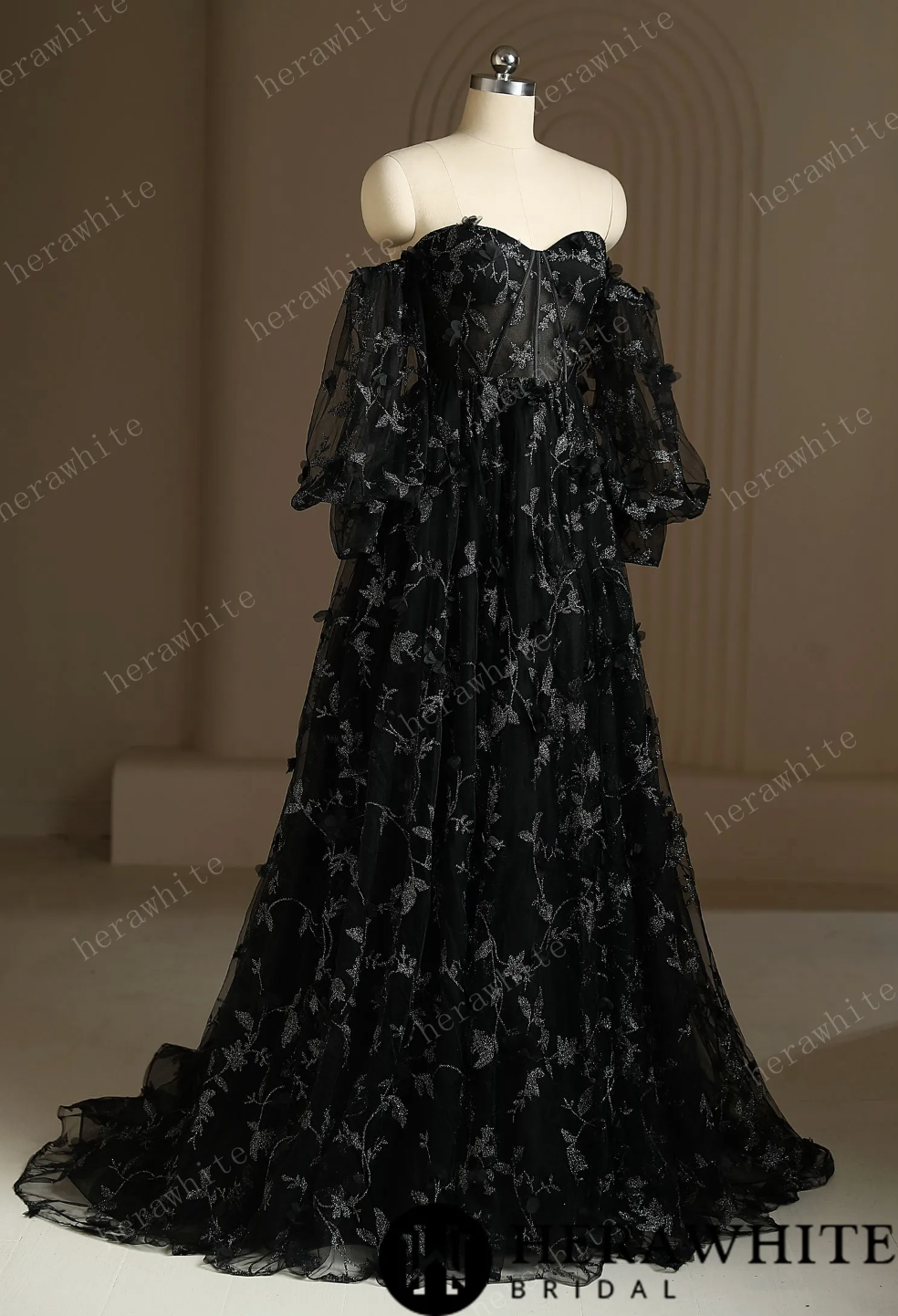 3D Lace Black Embroidery Wedding Dress, This stunning black wedding dress boasts an exquisite 3D lace appliqué embroidery and a detachable sleeve design. The high-quality lace edges add a touch of charm and elegance to the overall look, while the sleeves can be easily removed as desired, giving you the flexibility to customize your look for any occasion during your special day.